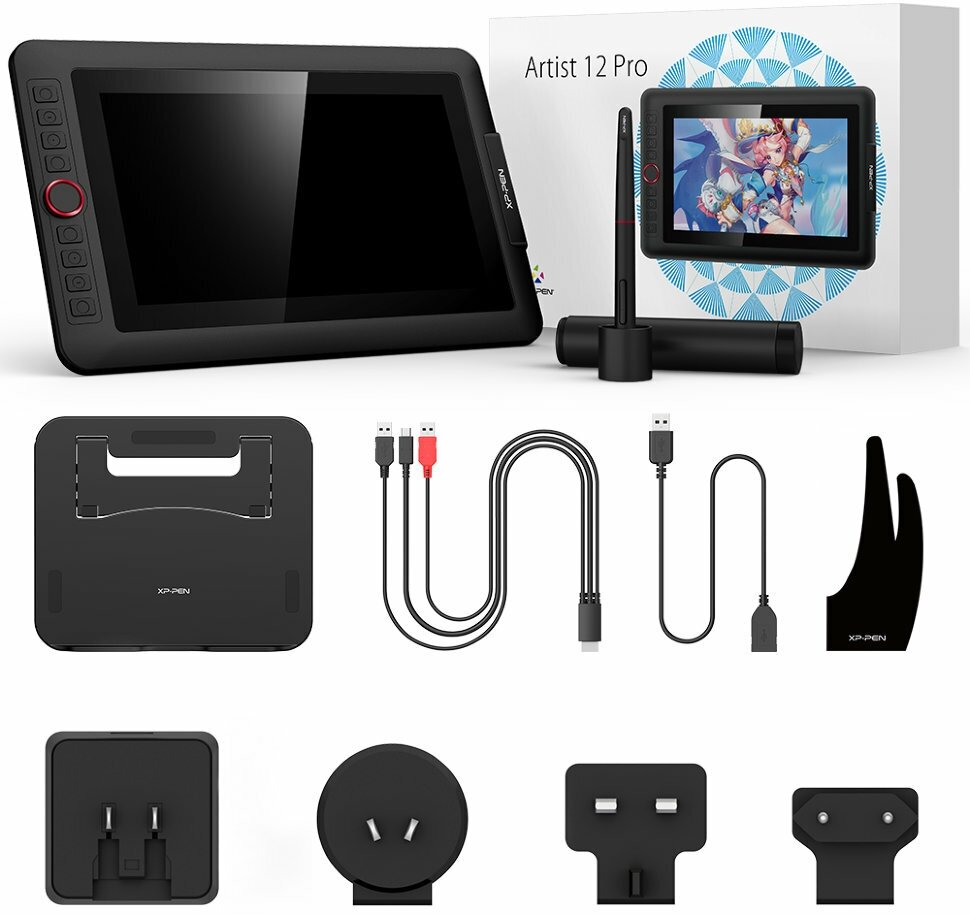 Interactive graphic display, PA2 passive pen, 8 replacement nibs, pen pouch, pen nib replacement clip, display stand, glove, quick start guide, napkin