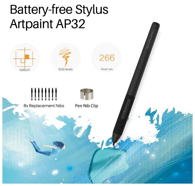 Type: graphics tablet, screen diagonal: 4, OS compatible: Android, OS X, Windows, screen resolution: 1920x1080, pressure levels: 8192, lines per inch lpi: 5080, pen, pen tilt sensitivity, working length
