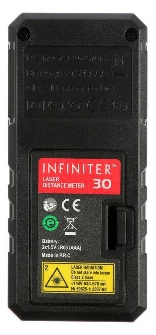 Type: laser, measurement range without reflector: 30 m, minimum measurement distance: 5 cm, measurement accuracy: 3 mm, number of reference points: 2, number of stored measurements: 99, display backlight, auto-off