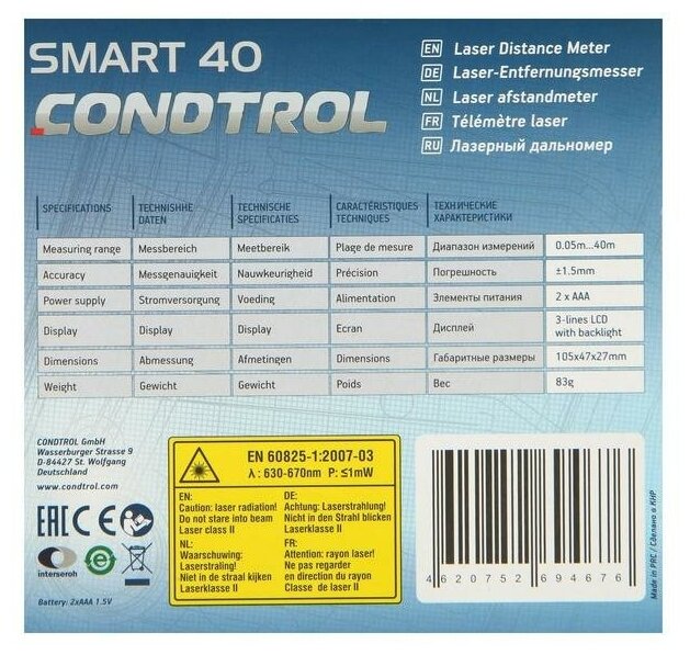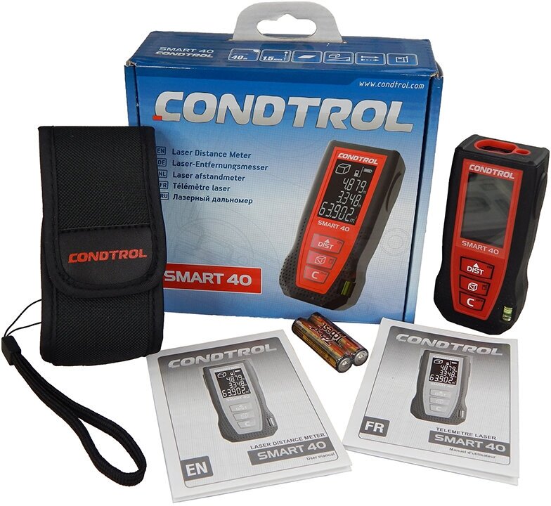 Type: laser, measuring range without reflector: 40 m, minimum measuring distance: 5 cm, measuring accuracy: 1.50 mm, number of reference points: 2, display backlight, sound indication, auto power off, shock