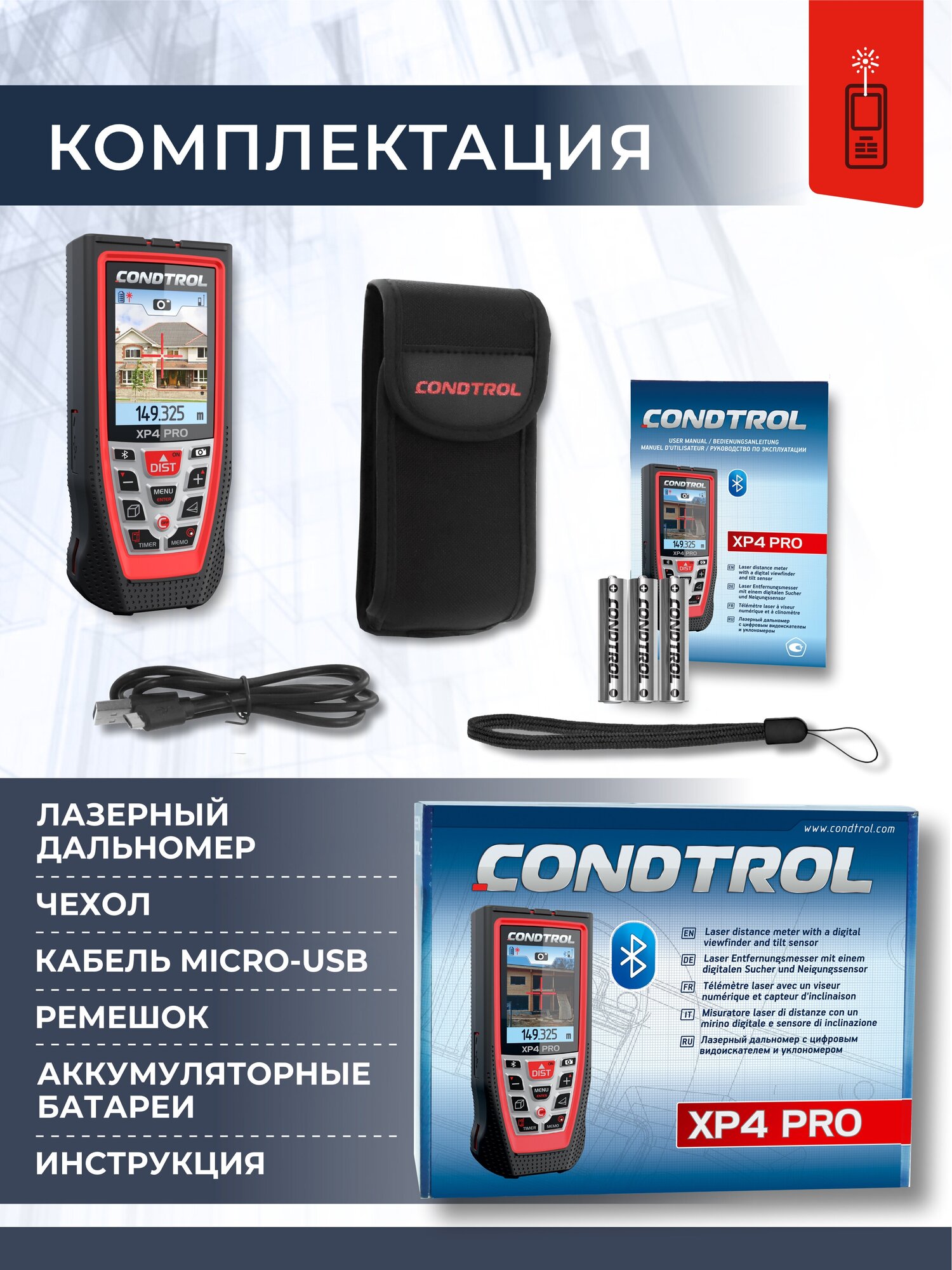 Four-line display, timer, two-axis inclinometer, digital level, digital viewfinder, 1 MP camera, flip-down bracket, 1.2V NiMH 800 mAh AAA, case, microUSB cable, strap, 136x59x28 mm<br>