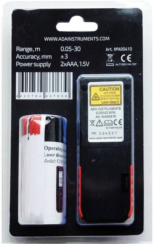 Complete set: range finder, batteries, plastic case, instruction; dimensions 108 x 38 x 29 mm