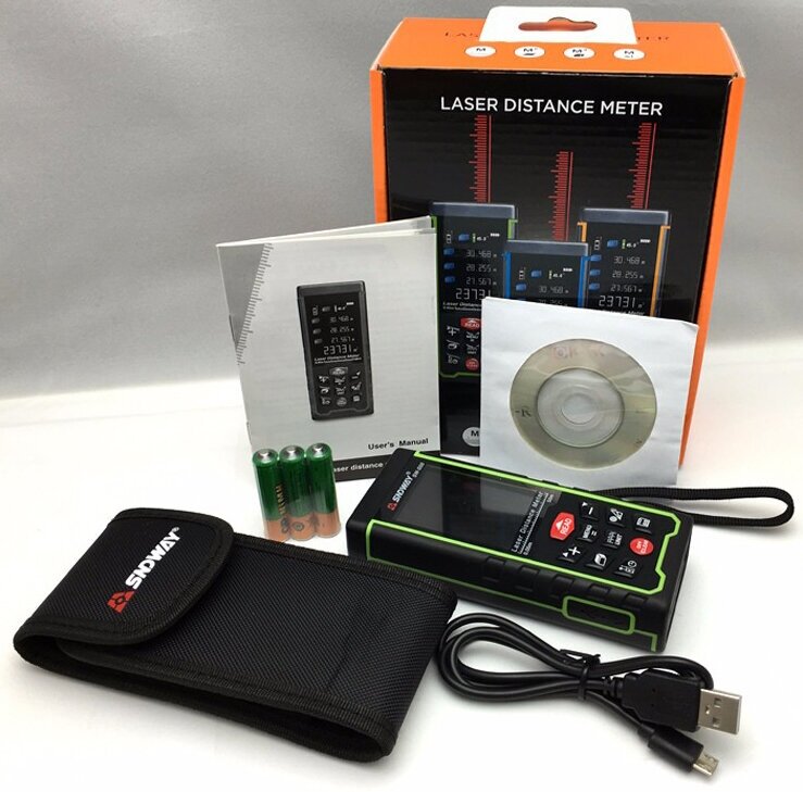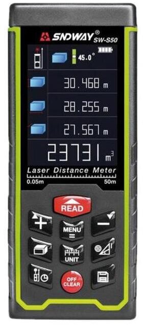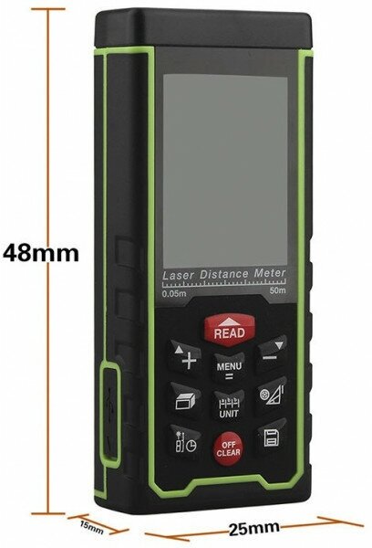 Type: laser, measurement range without reflector: 50 m, minimum measurement distance: 5 cm, measurement accuracy: 2 mm, number of reference points: 4, number of stored measurements: 100, color display, backlight for