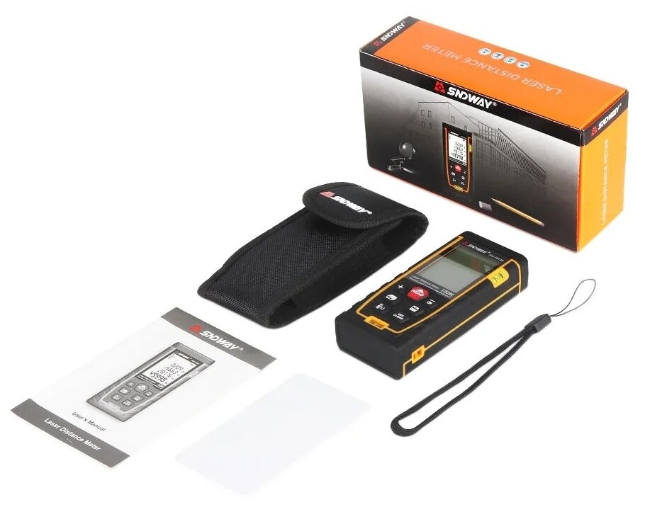 Included laser rangefinder, case, instructions, reflective plate; units of measurement: meters / inches / feet; automatic backlight; laser type: 635 nm, <1 mW; automatic laser shutdown: after 20 seconds; automata