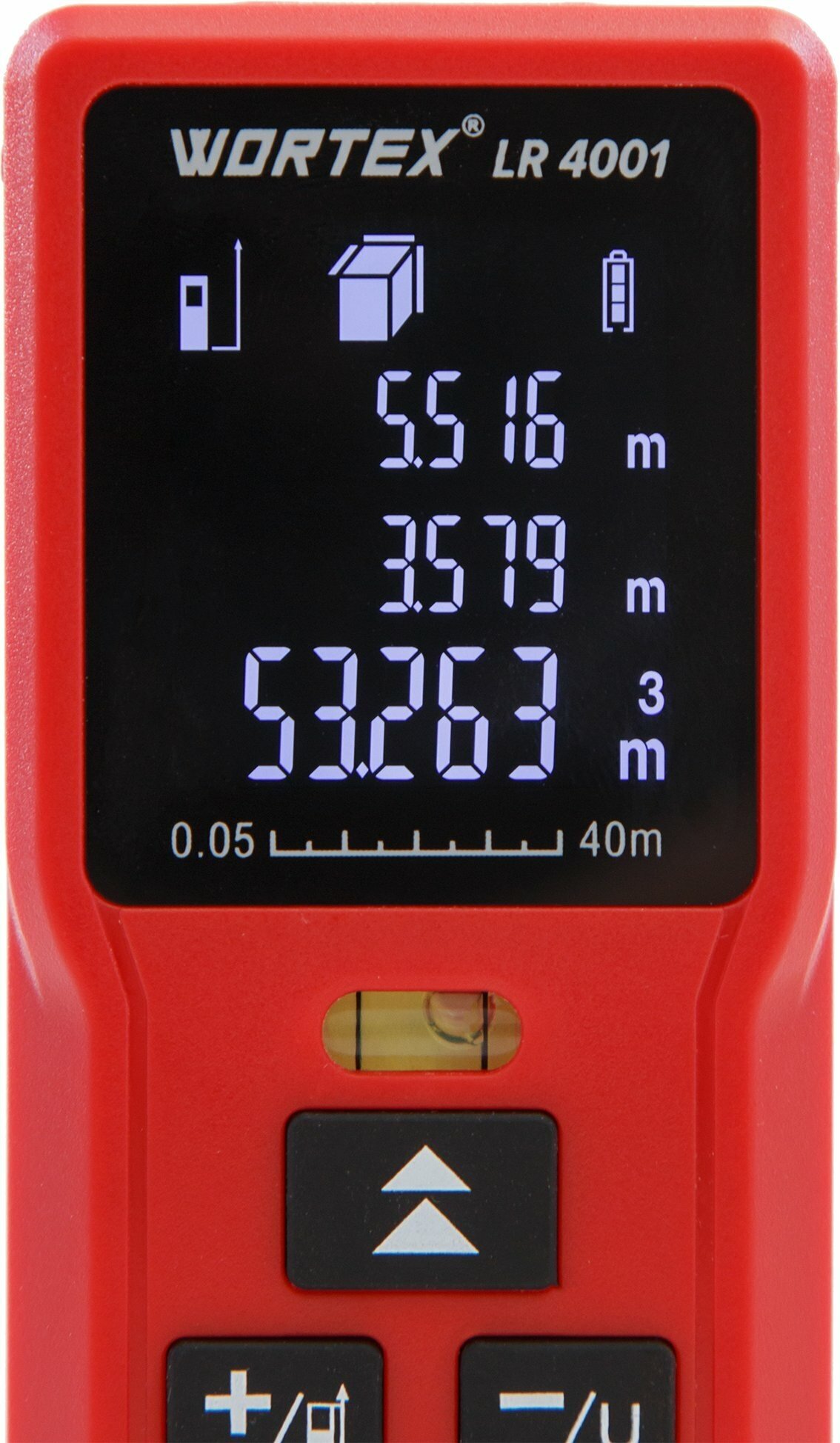 Type: laser, measurement range without reflector: 40 m, minimum measurement distance: 5 cm, measurement accuracy: 2 mm, number of stored measurements: 20, display backlight, auto-off, Pythagorean function, next function