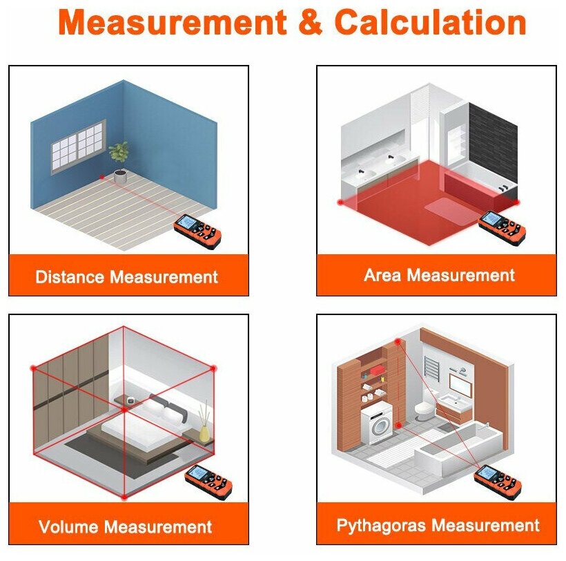 Type: laser, display backlight, addition/subtraction function, volume calculation function, continuous measurement function, area calculation function