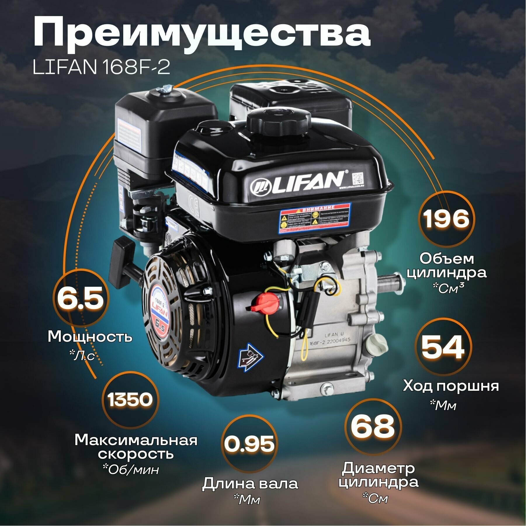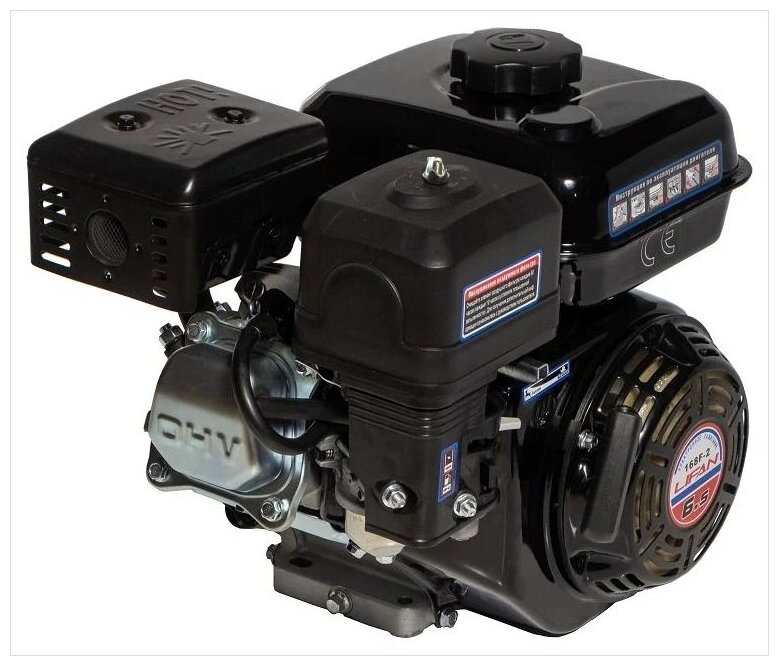 Cylinder diameter 68 mm, piston stroke 54 mm, compression ratio - 8.5: 1, torque - 11 Nm at 2500 rpm. in min., contactless electronic ignition system, manual start, shaft type - Q type, shaft length 58.5 mm