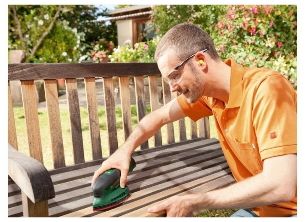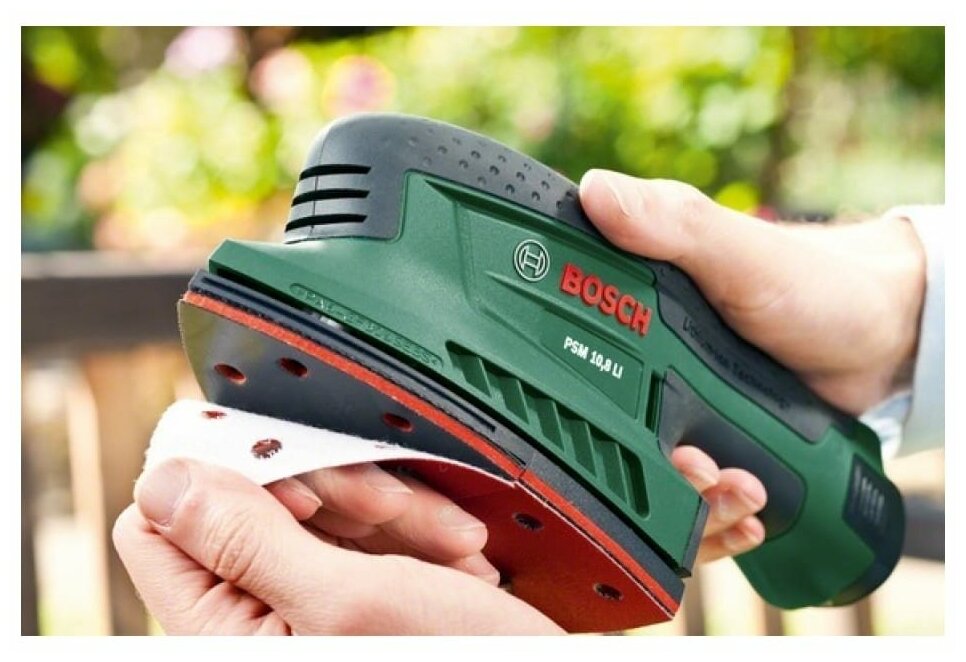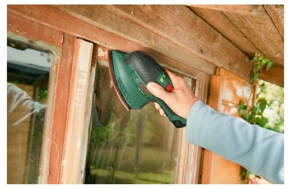 One battery, charger, vacuum cleaner adapter, 3 sanding sheets