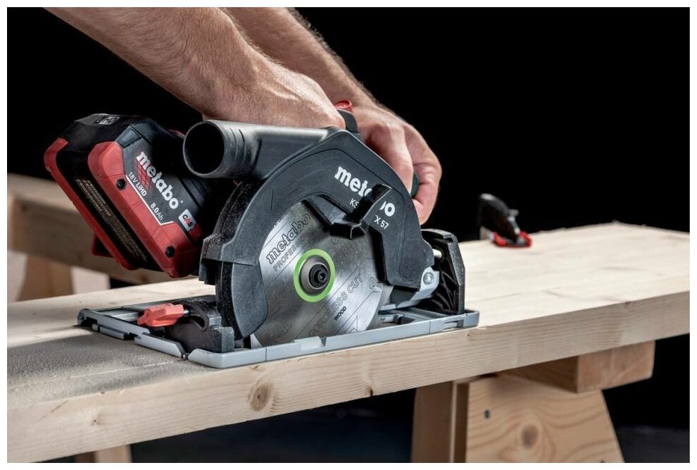 Two batteries, charger, saw blade, rip fence, wrench, MetaLoc case