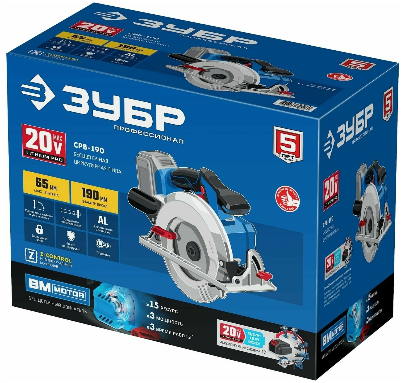 ZUBR 20V, brushless, without battery, In a box, circular CPB-190 professional
