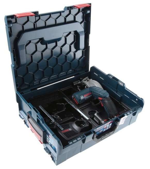 Two batteries, charger, saw blade, vacuum cleaner adapter, wrench, rip fence, L-BOXX case