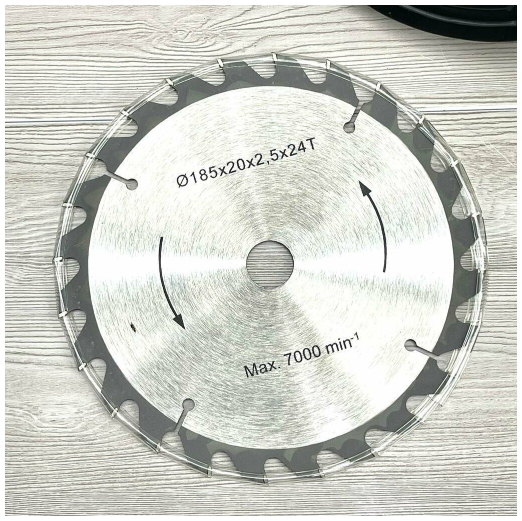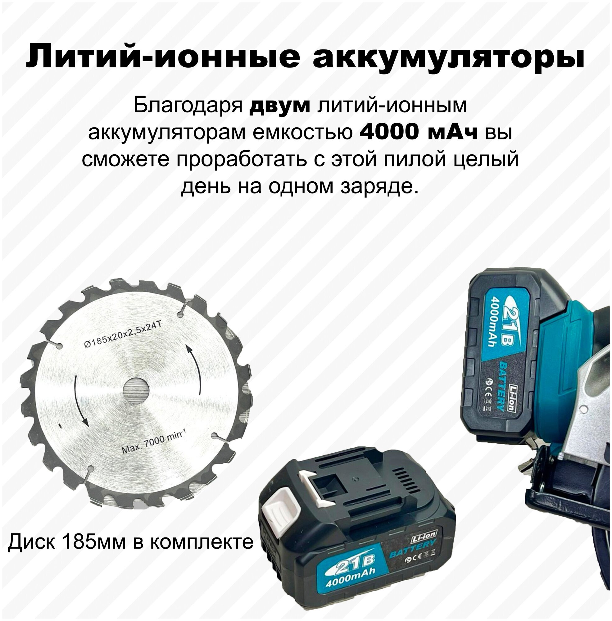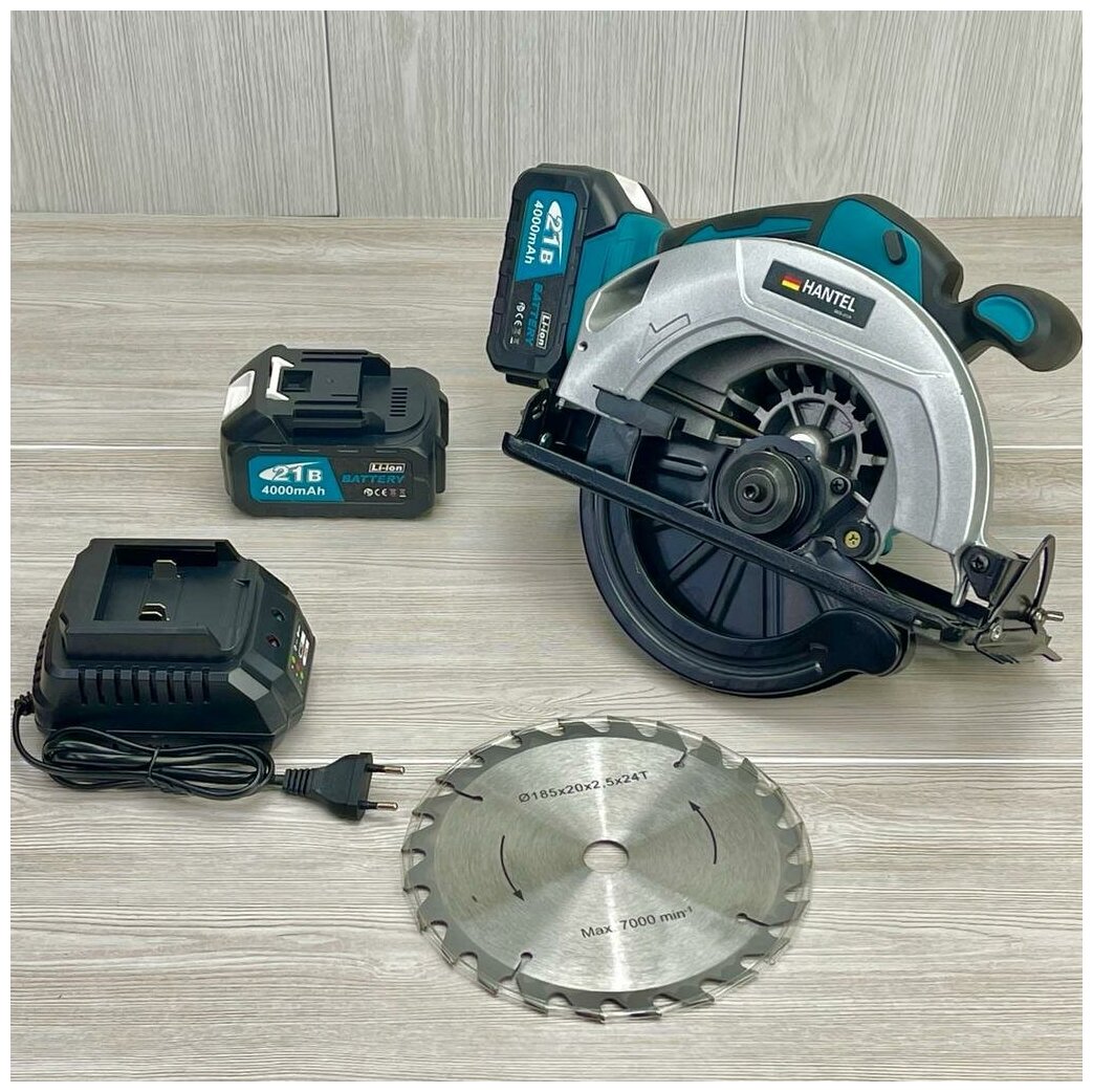 Circular saw 1pc, battery 2pc, charger 1pc, disk 185x20x2 1pc, rip fence 1pc, wrench 1pc, instruction manual 1 copy.