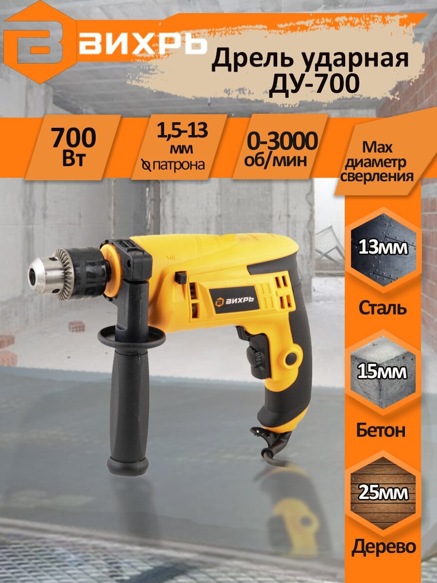Description: Type: drill, power type: mains, presence of impact for drill: impact, chuck type: key, functions: reverse, speed adjustment, power consumption: 701 W, maximum torque: 35 Nm, design features