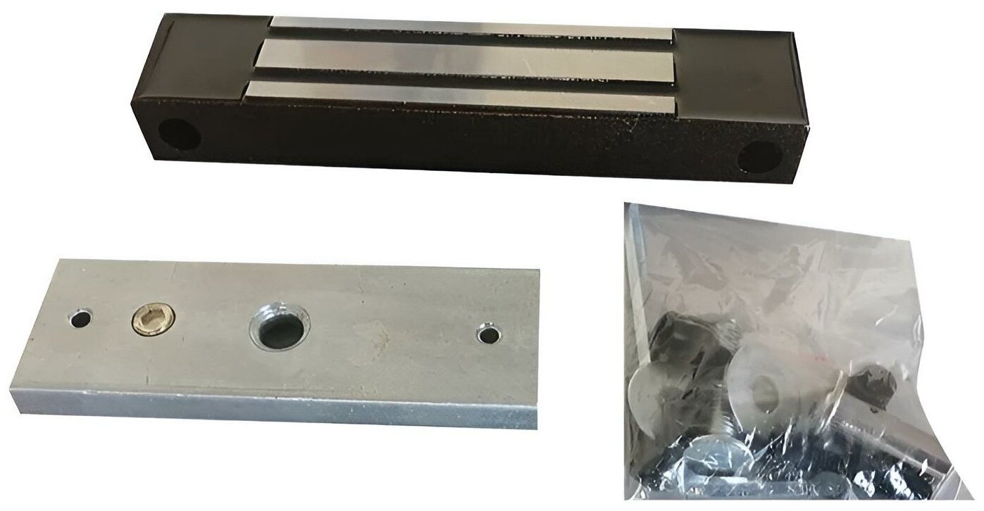 - Electromagnetic lock, 1 pc. - Anchor, 1 pc. - Anchor screw, 1 pc. - Steel washer, 2 pcs. - Rubber washer, 1 pc. - Anchor heel, 1 pc. - Grover washer, 2 pcs. - Corner, 1 pc. - Lock fastening screw, 2 pcs. - Clamp, 2 pcs. - Key, 1 pc.
