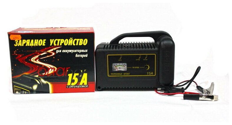 Modest dimensions and weight in combination with a large charging current. Built-in electronic reverse polarity protection. Manual adjustment of the maximum charging current. Equipped with a pointer ammeter. Has storage mode