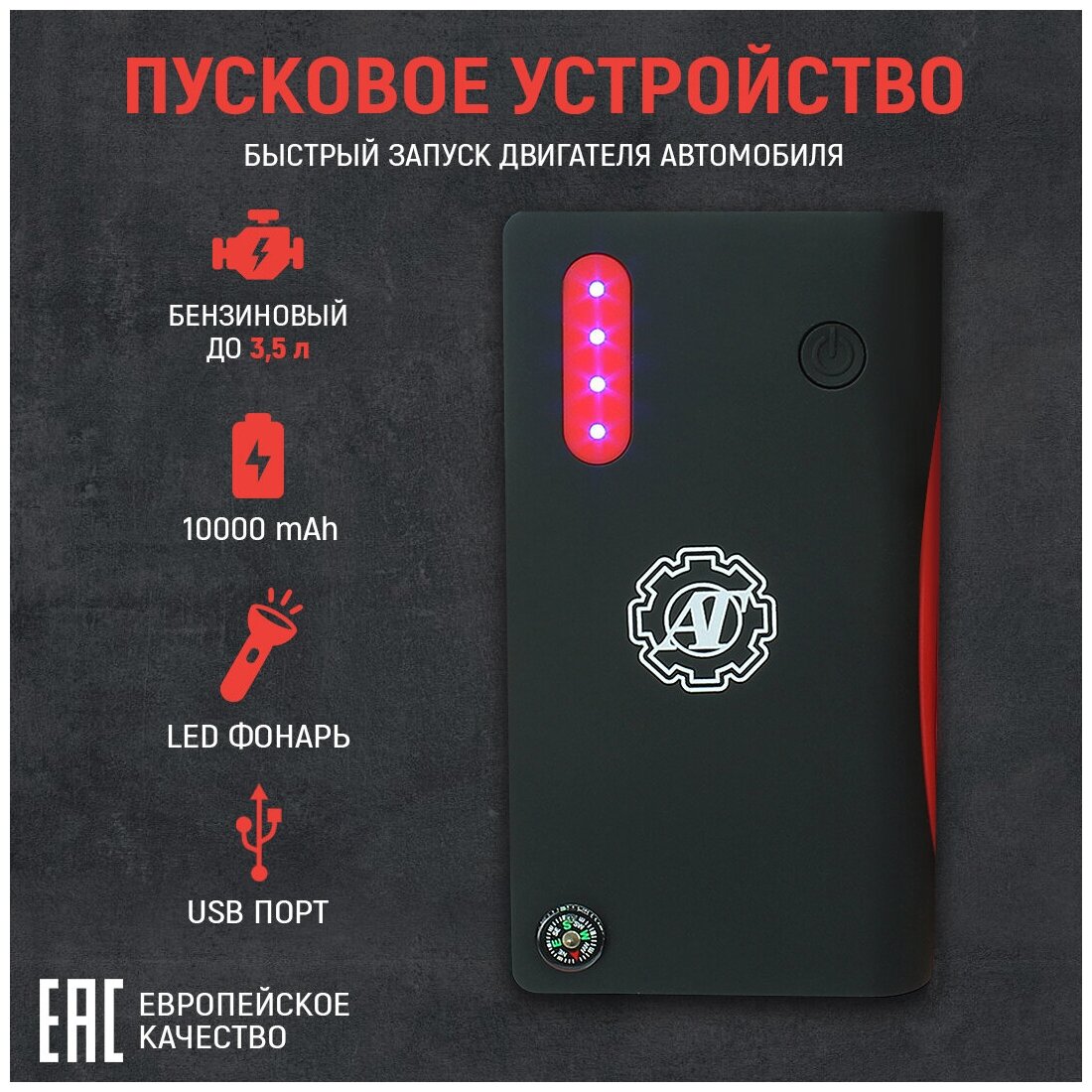 Type: starter, built-in battery, Built-in battery capacity, mAh: 10000, functions: built-in flashlight, charge current regulation: no, additional connectors: 2xUSB