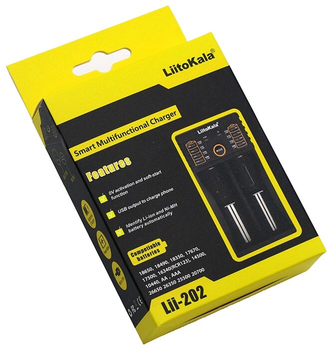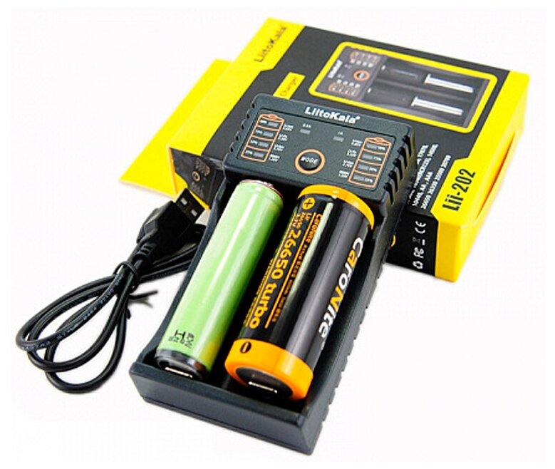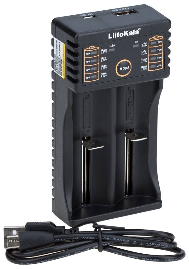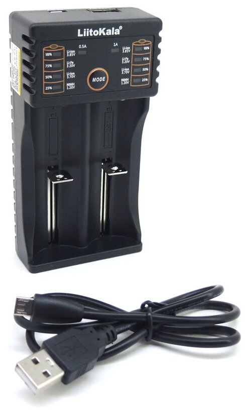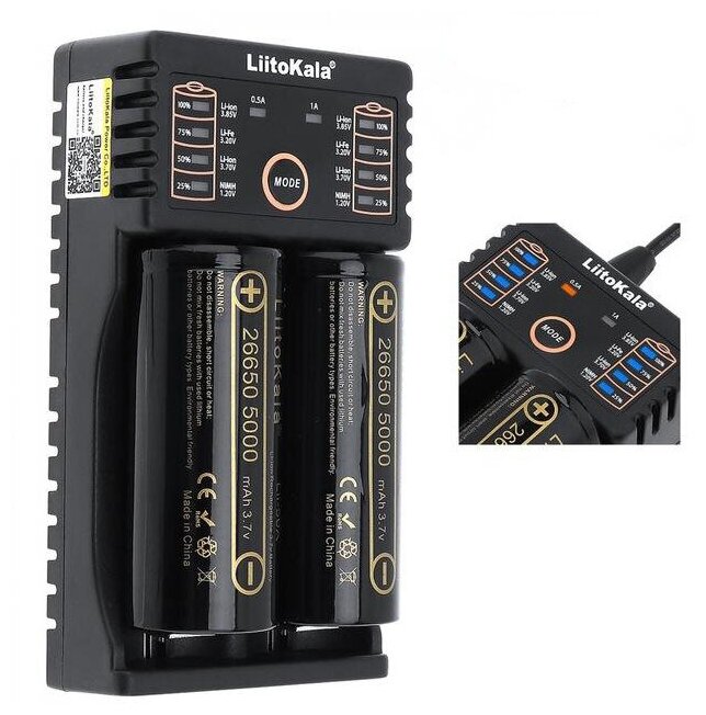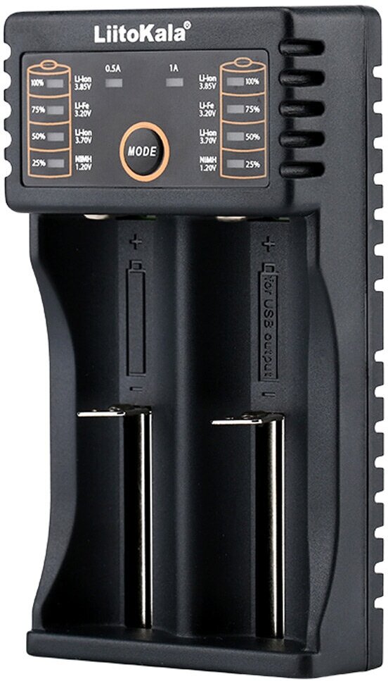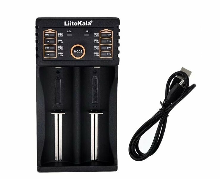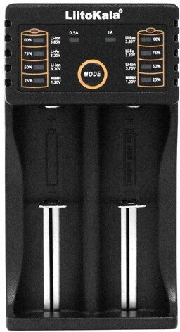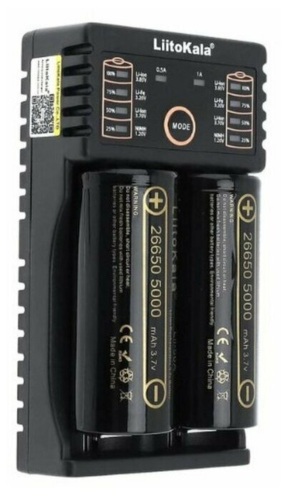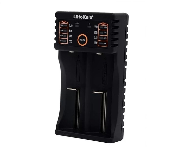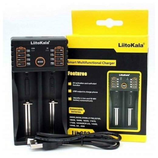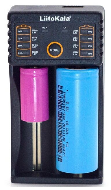 Battery type: Li-Ion, LiFePO4, Ni-Cd, Ni-Mh 0 , 26500, 26650, AA, AAA, C, 16340 rcr123a, 26500 et al., C R14, LiFePO4: 18650, Ni-Mh/Ni-Cd: AAA, SC; Li-Ion, number of places for batteries: 2, power supply: from USB, from