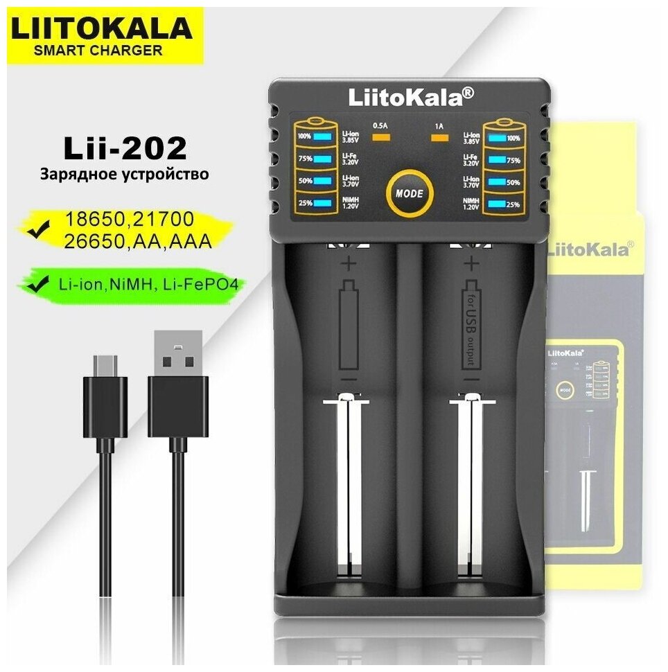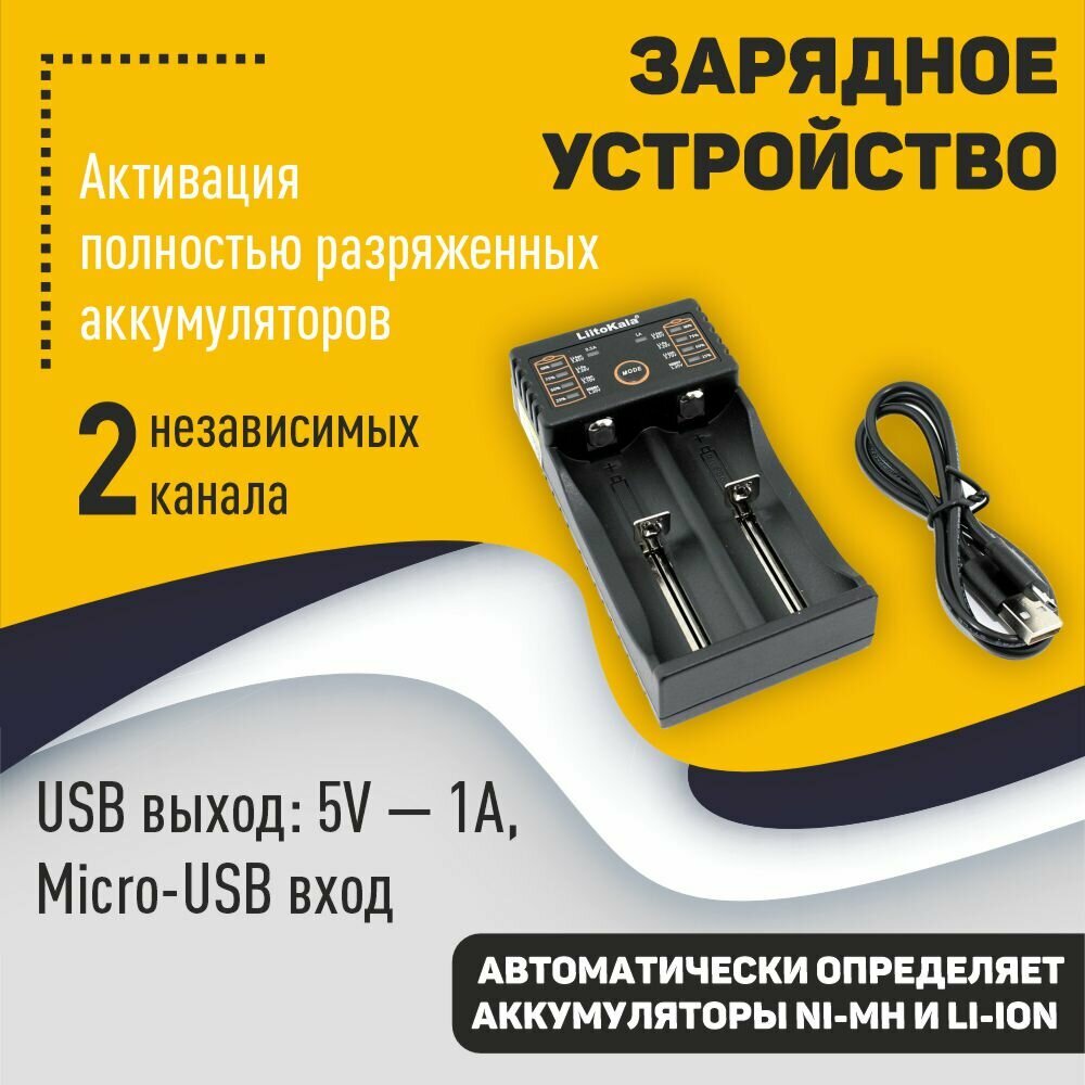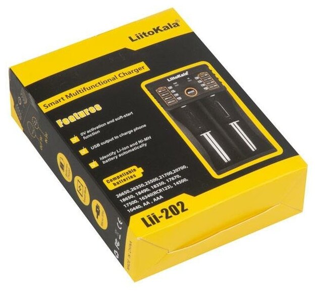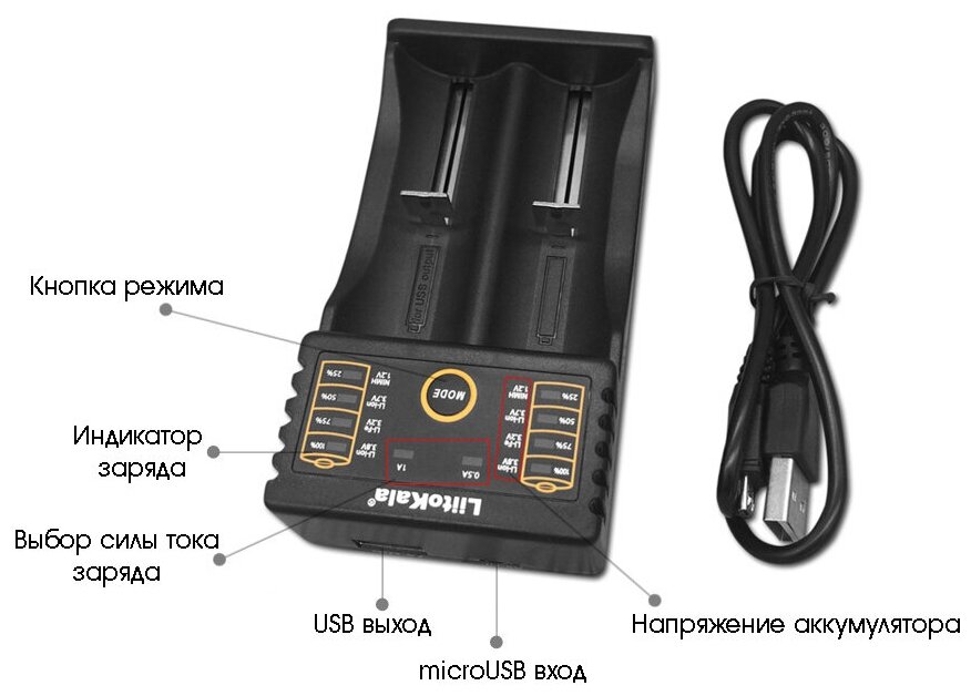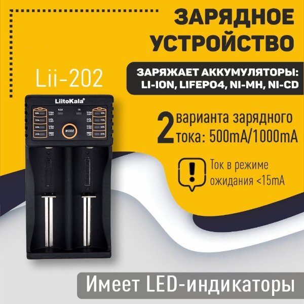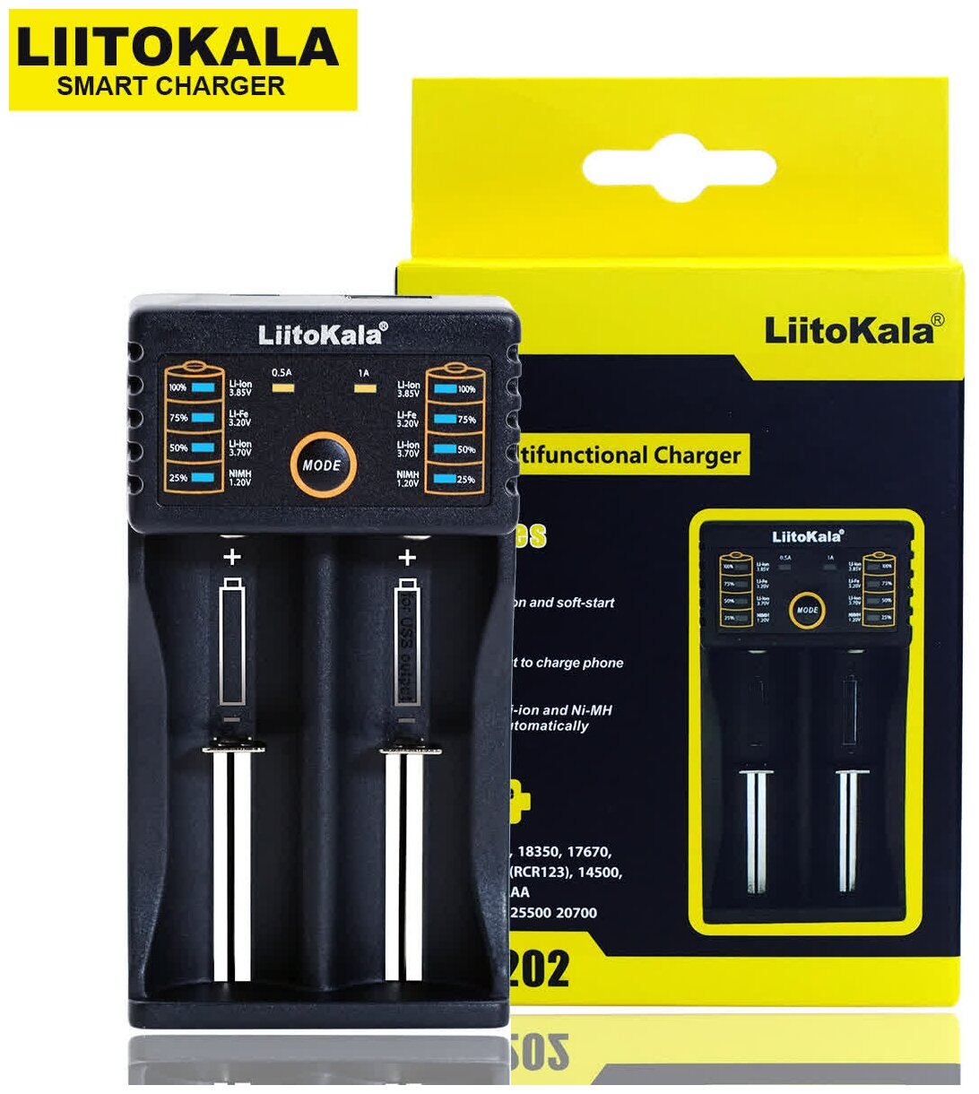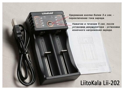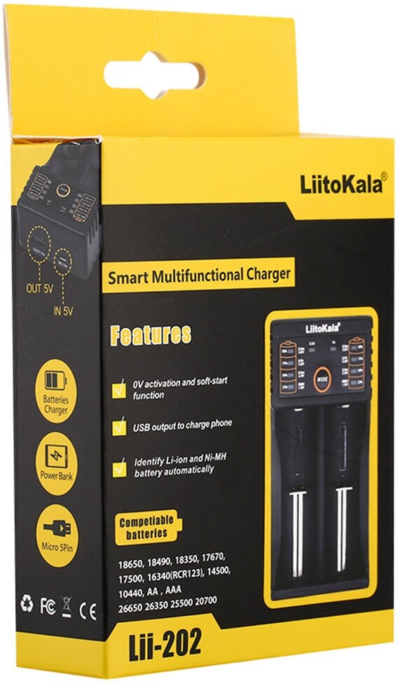 Battery type: Li-Ion, LiFePO4, Ni-Cd, Ni-Mh 0 , 26500, 26650, AA, AAA, C, 16340 rcr123a, 26500 et al., C R14, LiFePO4: 18650, Ni-Mh/Ni-Cd: AAA, SC; Li-Ion, number of places for batteries: 2, power supply: from USB, from