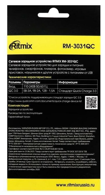 Mains charger RITMIX RM-3031QC