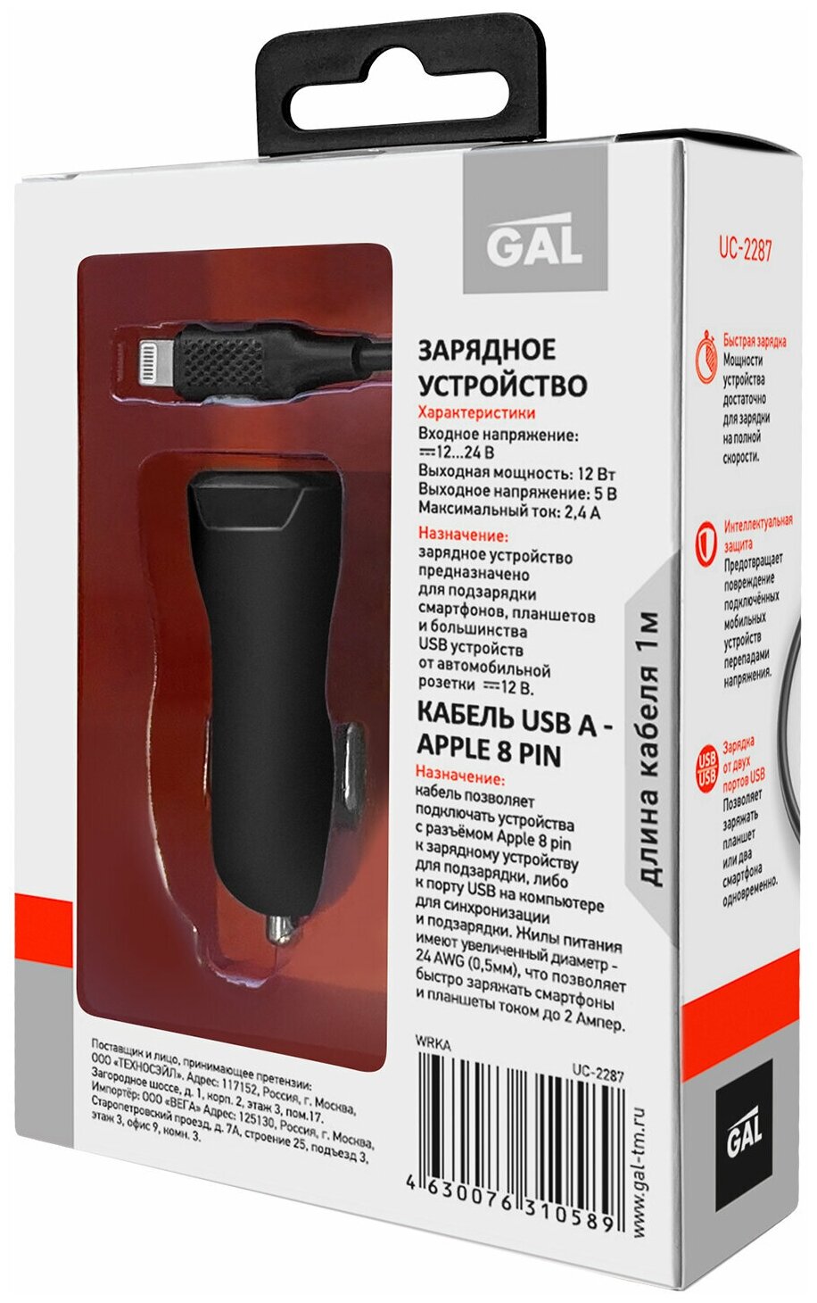 Car charger GAL UC-2287 complete with USB A - Apple 8 pin cable