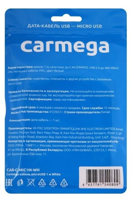 Smartphone charging cable Carmega microUSB 1.0m black fast charging for phone