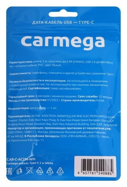 Smartphone charging cable Carmega TypeC 2.0m white