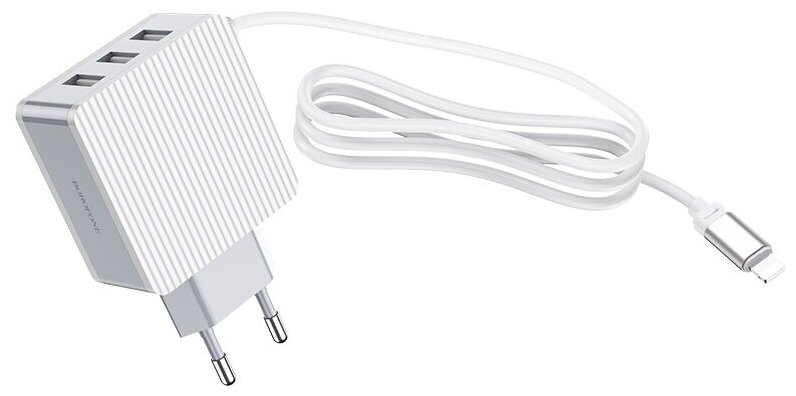 Mains charger Borofone, BA42A, 3 USB, with built-in Apple 8 pin cable, white