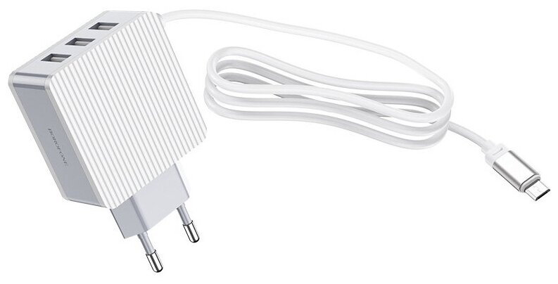 Mains charger Borofone, BA42A, 3 USB, with built-in Type-C cable, white
