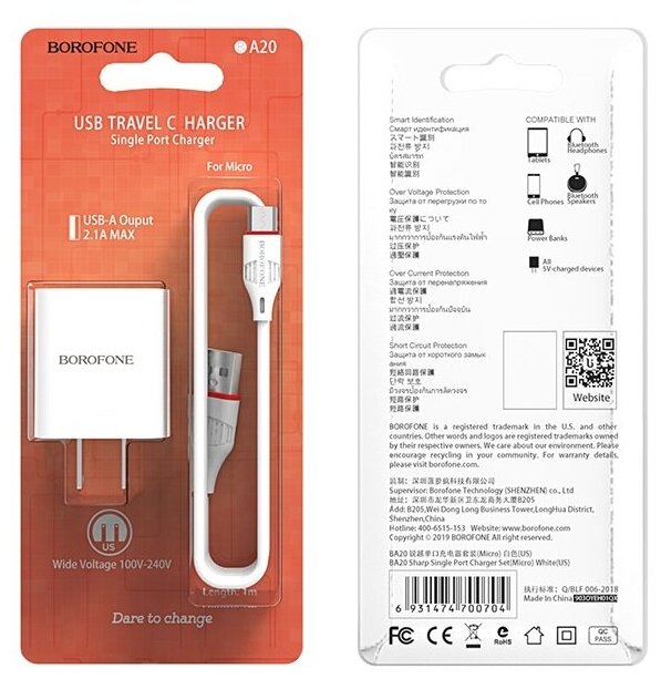 Mains charger Borofone BA20 Sharp, one USB port, set with Micro-USB cable, color white