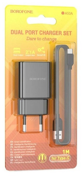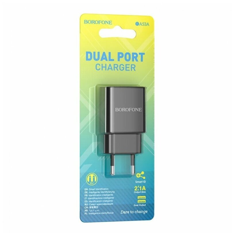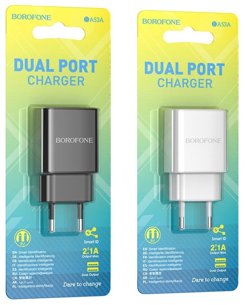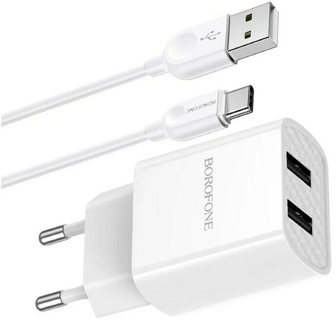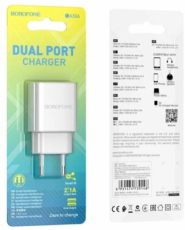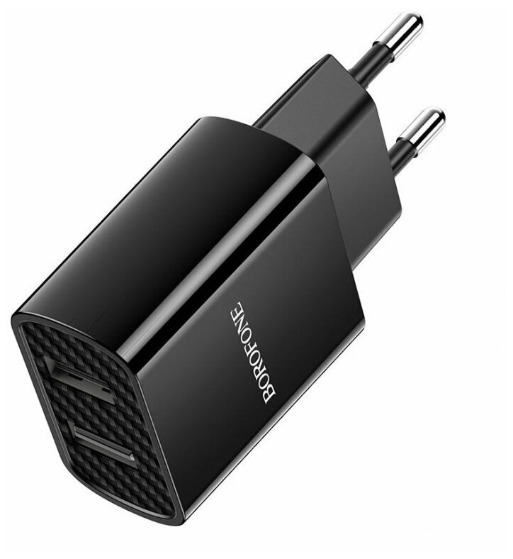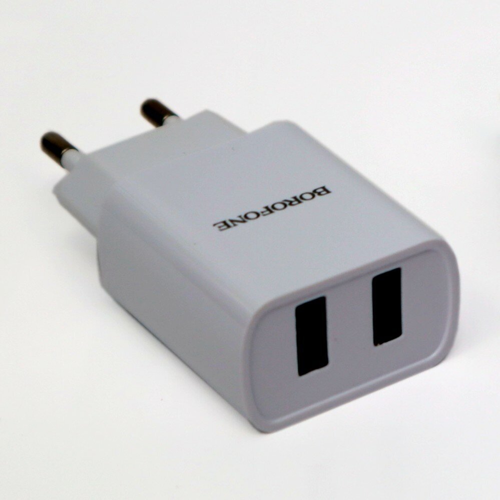 The Borofone BA53A mains charger has a power of 10.5W. The device has two USB ports with a current of 2.1 A. It is equipped with fire-resistant material that does not allow overheating. Input voltage 100-240W.