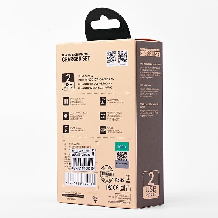 Cable connector: micro USB, number of connectors: 2, fast charging, fast charging standard: Qualcomm Quick Charge 3.0, maximum output current: 2.10 A, cable included, features: fast charging, overheating protection, cable included