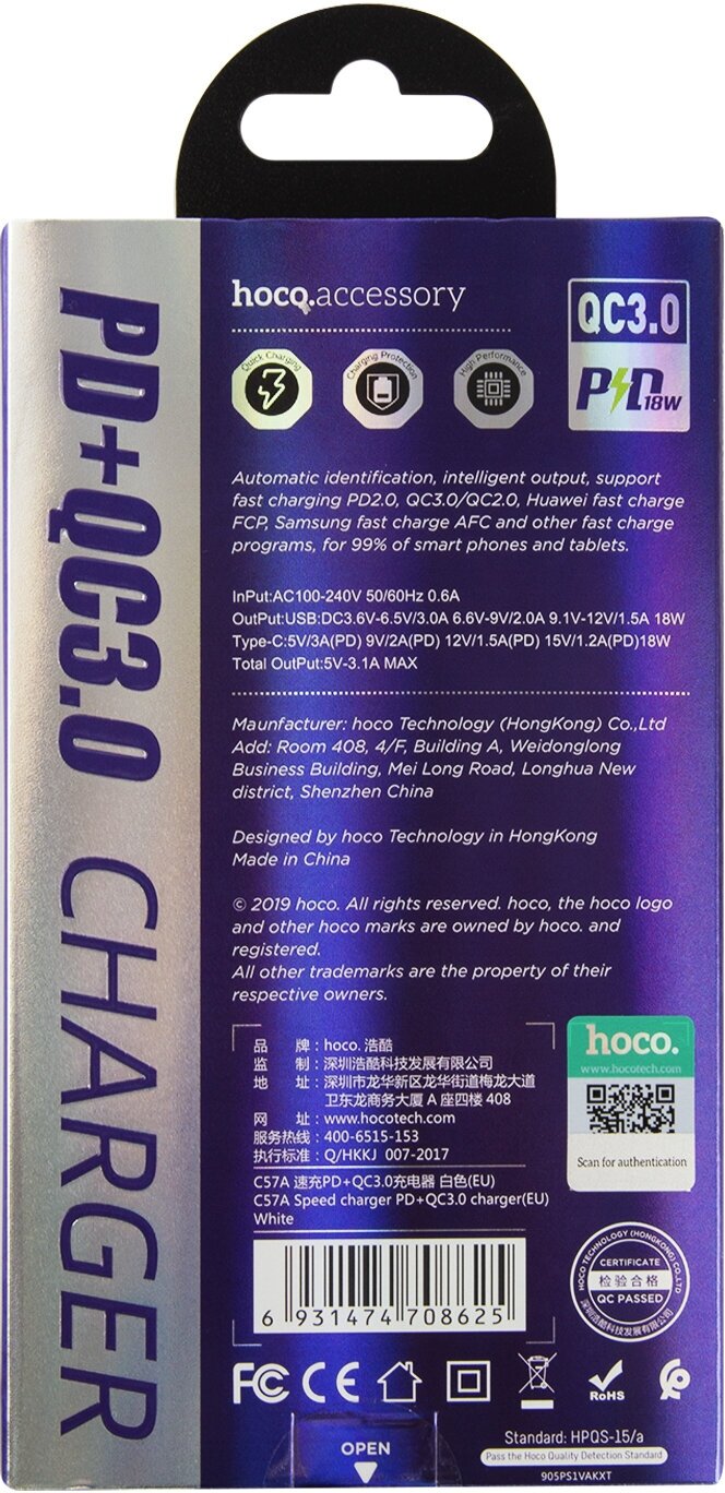 AC adapter 1 USB, Type-C HOCO, C57A, Speed, 3100mA, plastic, QC3.0, white