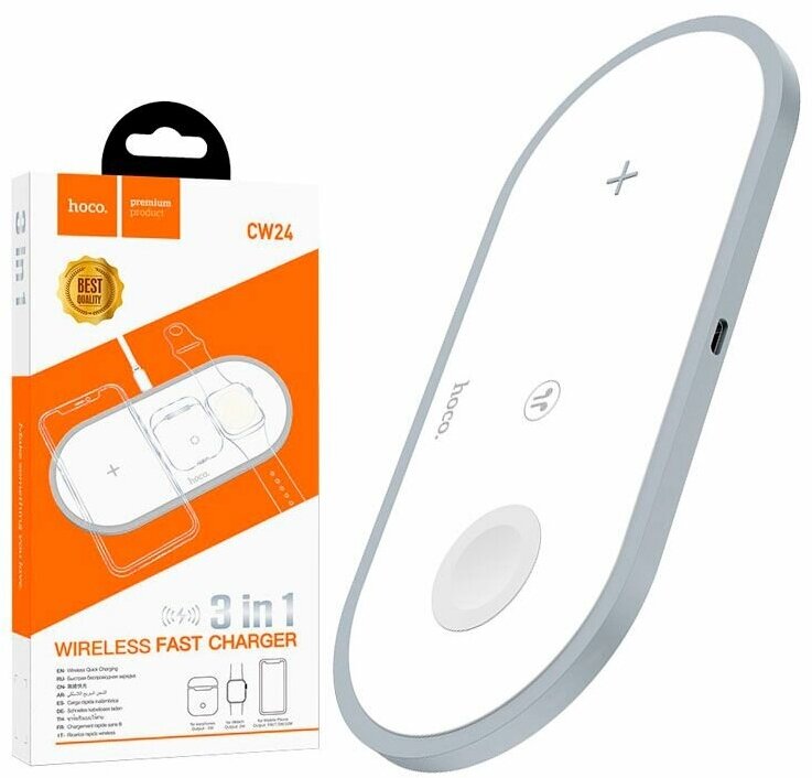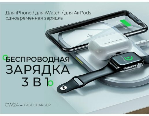 Charging platform for phone, watch and headphones, USB Type-C cable. Instruction.