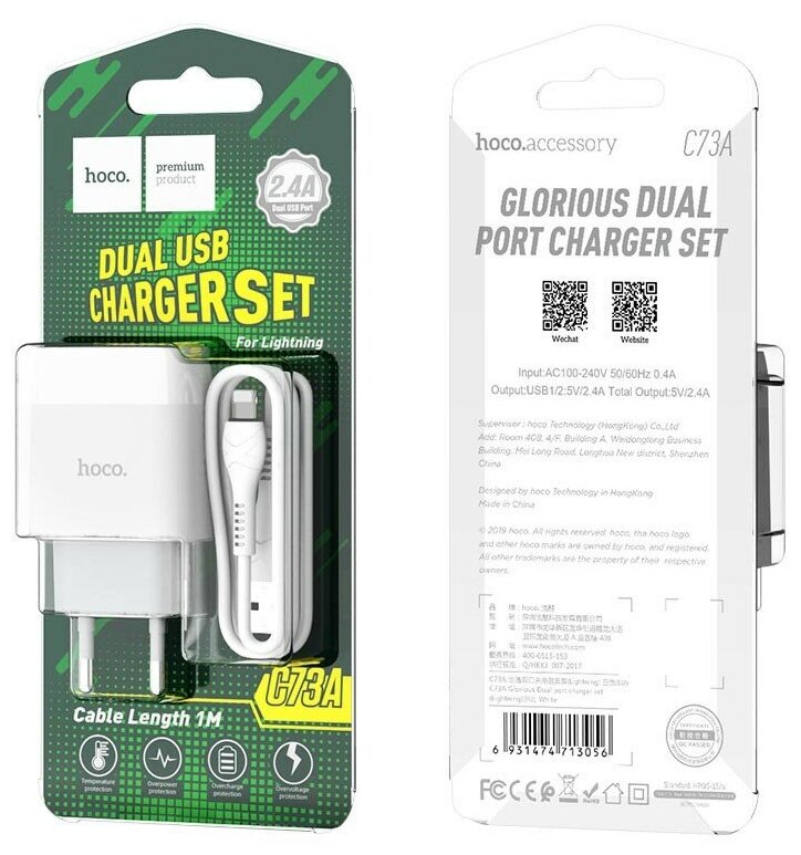Wall charger Hoco C73A Glorious 2xUSB with Lightning cable
