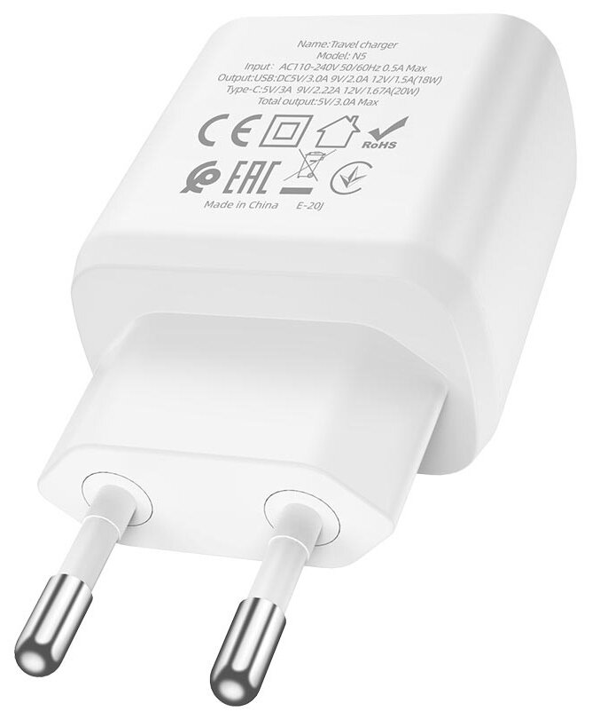 Mains charger Hoco N5 PD 20W + QC3.0 18W with USB and Type-C outputs, white