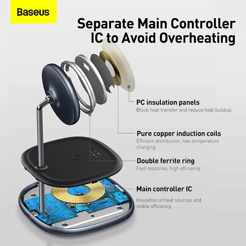 Base for wireless charging, AC adapter with connector, detachable cable, cable included
