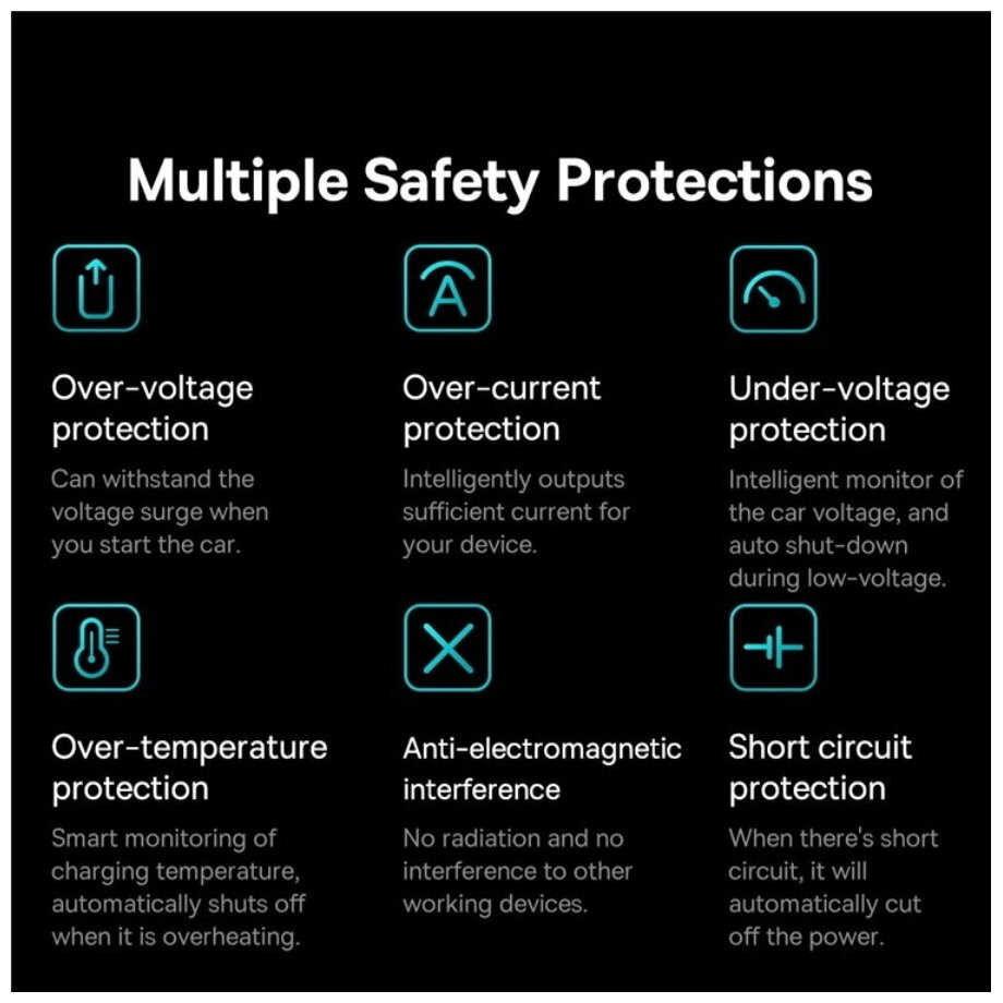Overheating protection, overvoltage protection, backlight, LED indicator, shockproof housing