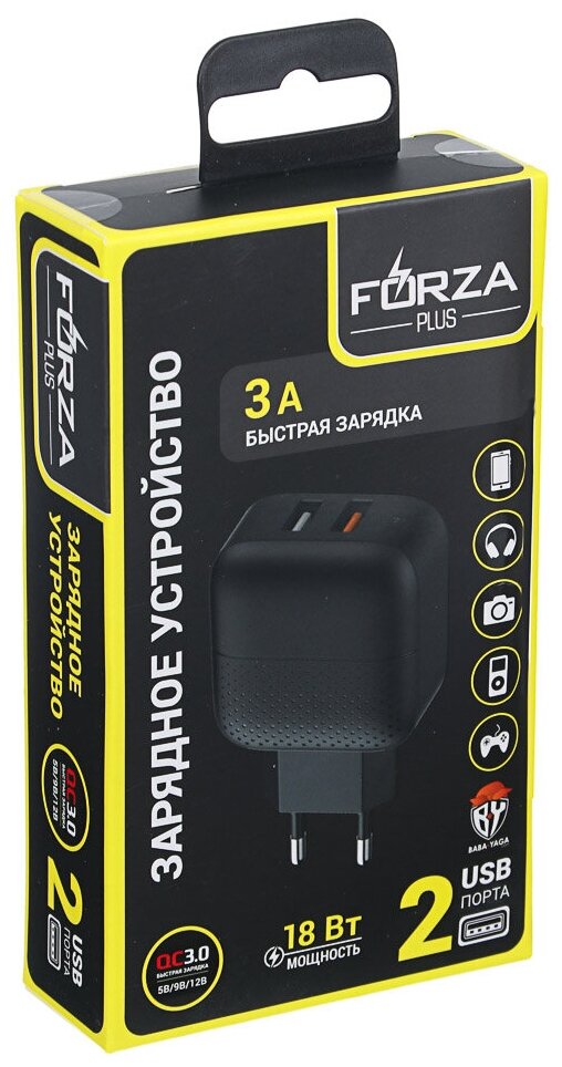 Charger FORZA, 110-240V, 2xUSB: fast charge 3A QC3.0+2.1A, plastic