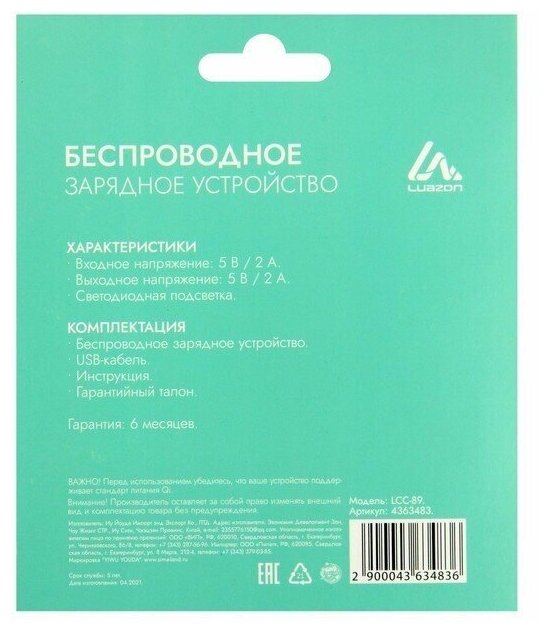 Wireless charger LuazON LCC-89, 2 A, with backlight, black 4363483