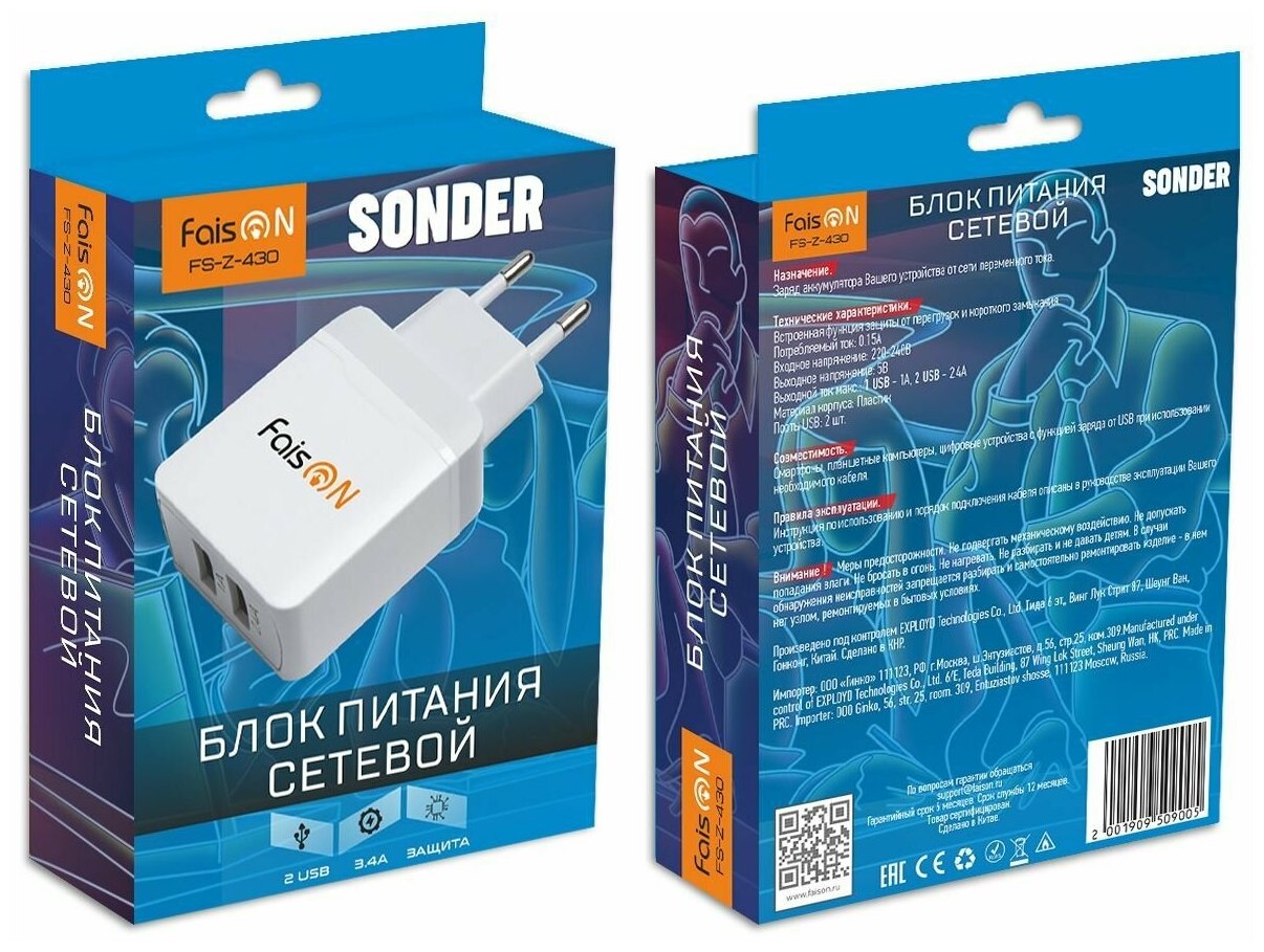 Power supply unit 2 USB FaisON SONDER FS-Z-430 3400mA, plastic, color: white