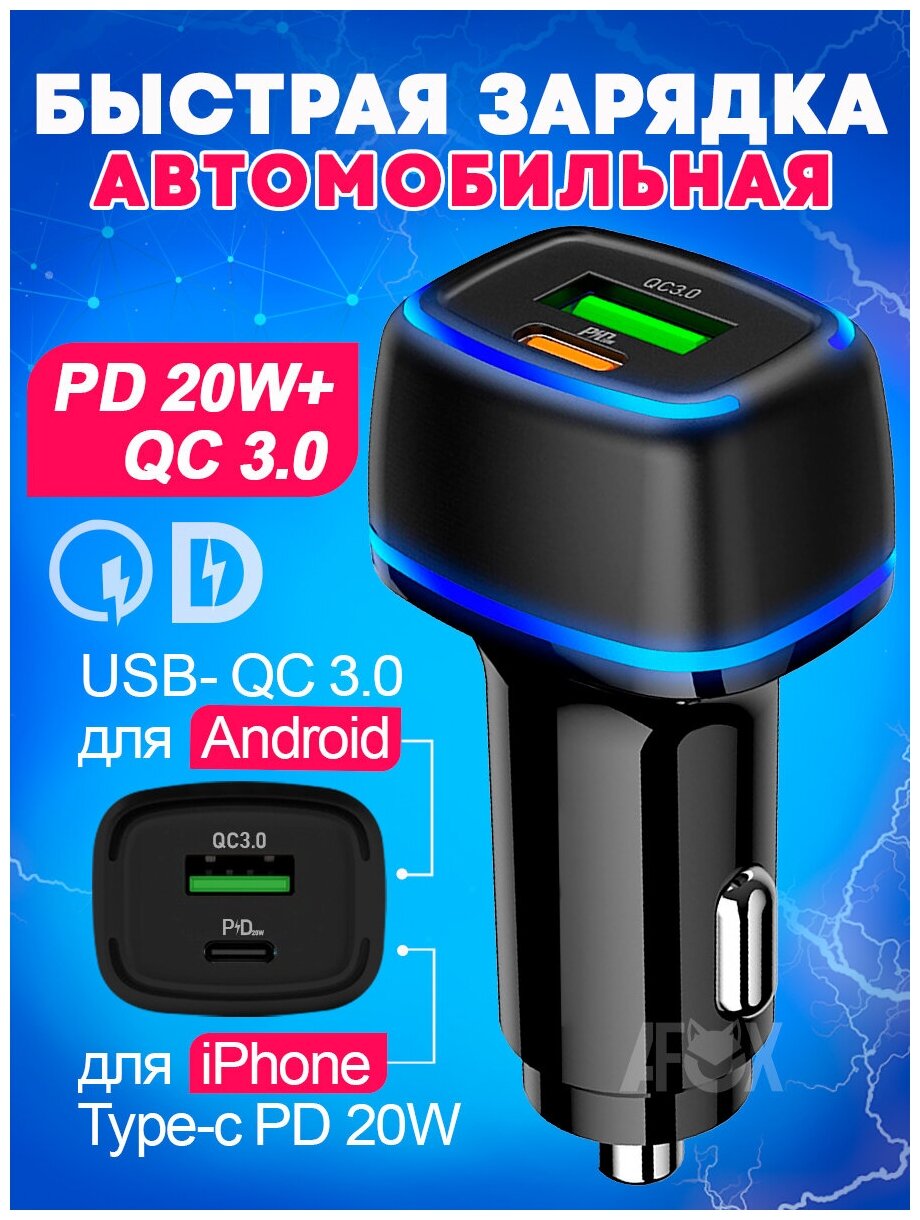 Car charger with 2 USB ports QC3.0 18W + USB Type-C PD 20W - 1 pc.