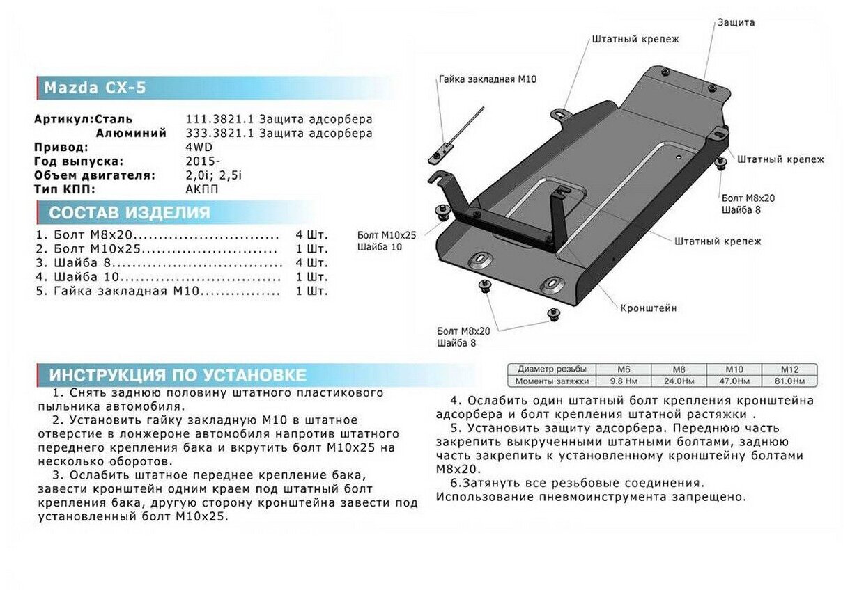 Canister Rival Mazda CX-5 4WD 2015-2017, aluminum 4 mm, with fasteners. 333.3821.1
