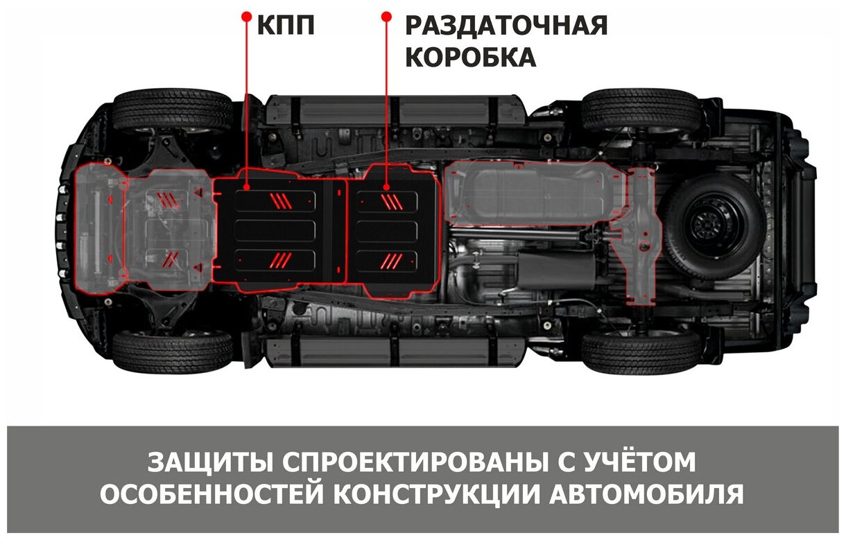 Type of protection: gearbox, transfer case, gearbox, transfer case, material: steel, stiffeners, powder enamel coating, thickness: 3 mm, length: 830 mm, width: 490 mm, weight: 9 kg