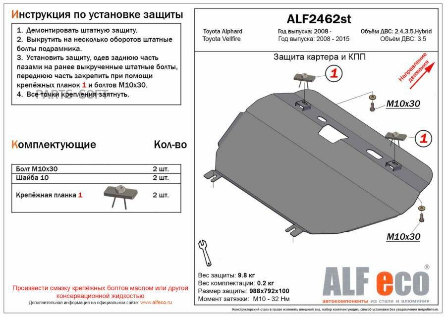 Engine Toyota Alphard 2008-2015, V-3,5 steel 2 mm ALFeco, ALF2462st, -