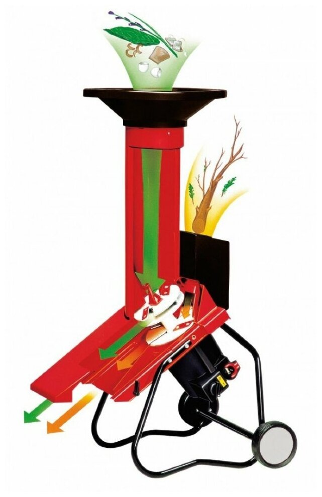 Engine type: electric, power: 2500 W, purpose: chopping branches and leaves, chopping system: cutting knives, branches diameter: 30–40 mm, design features: hopper, wheels, weight: 51 kg