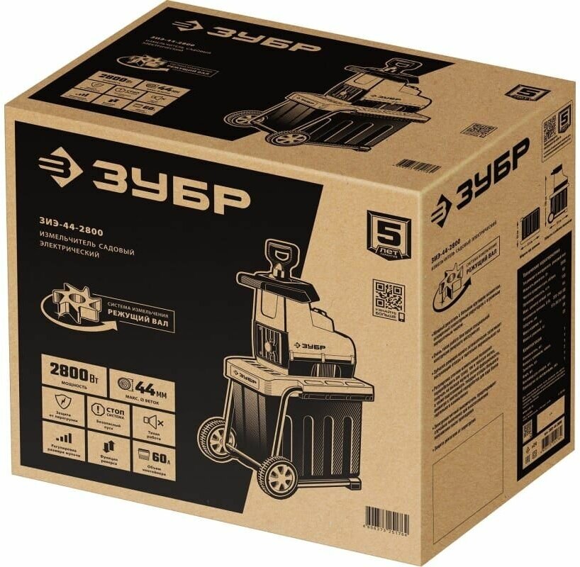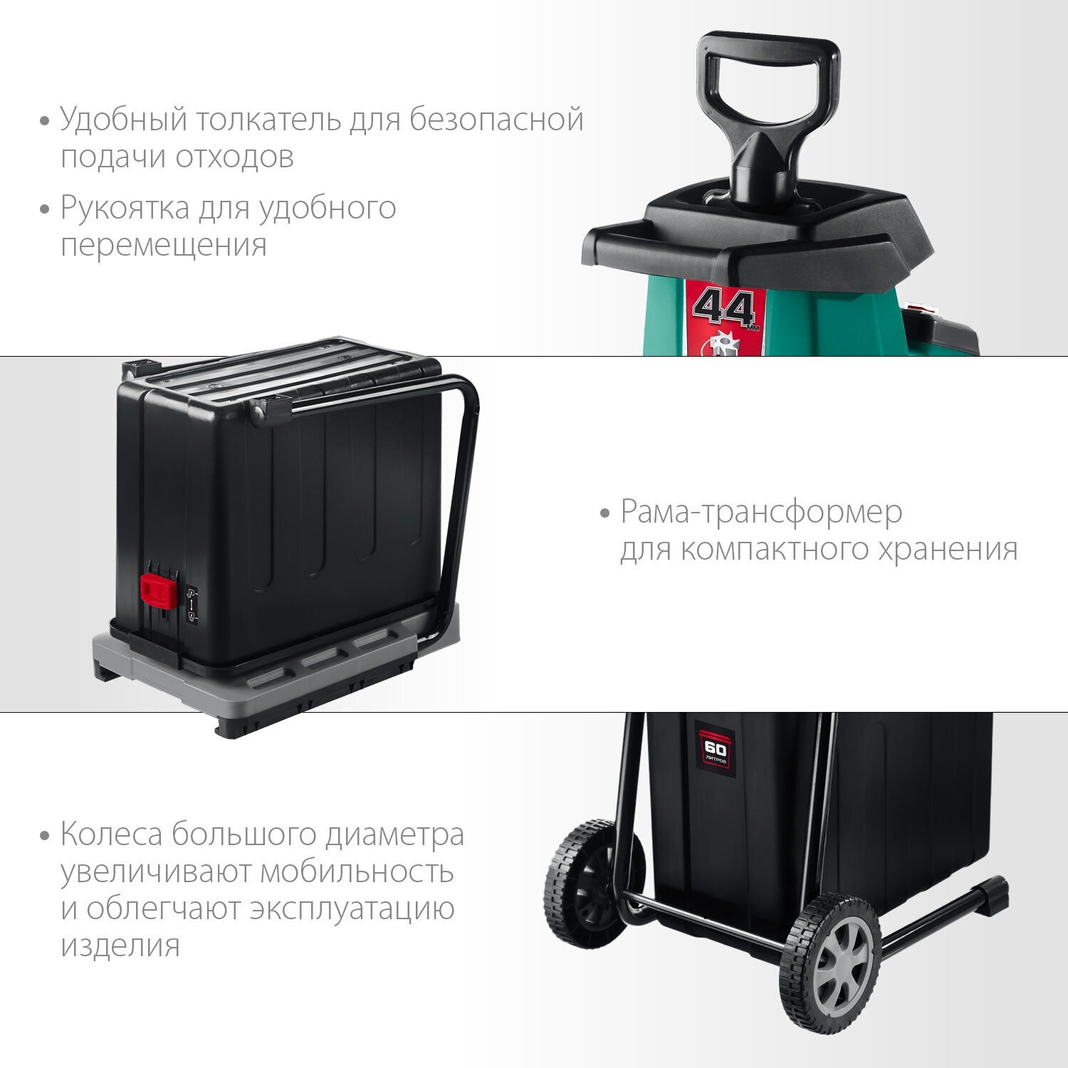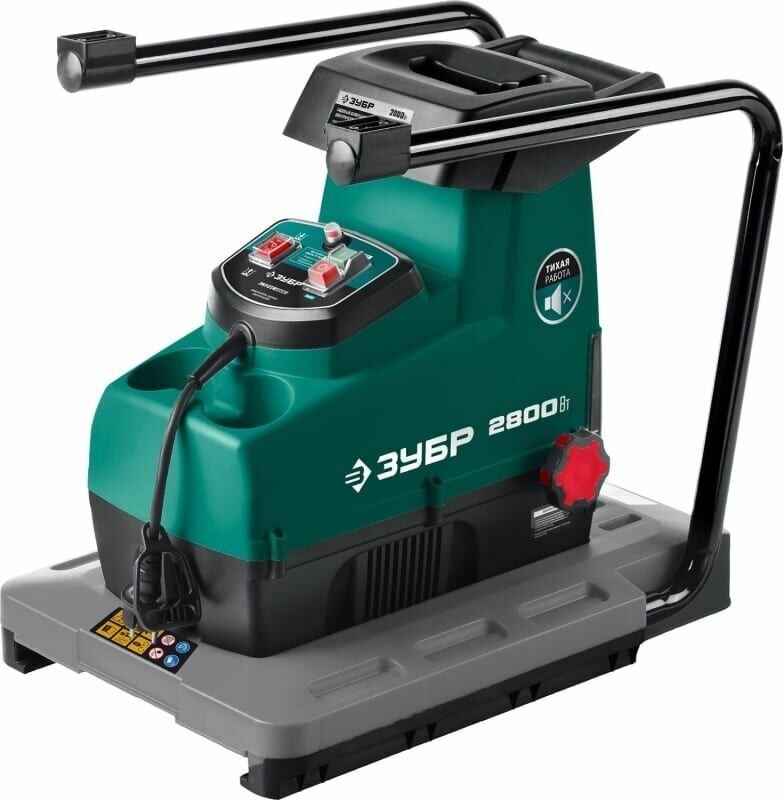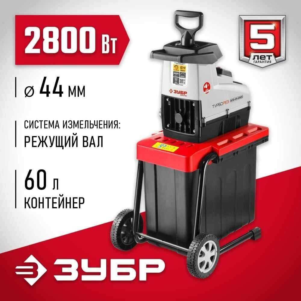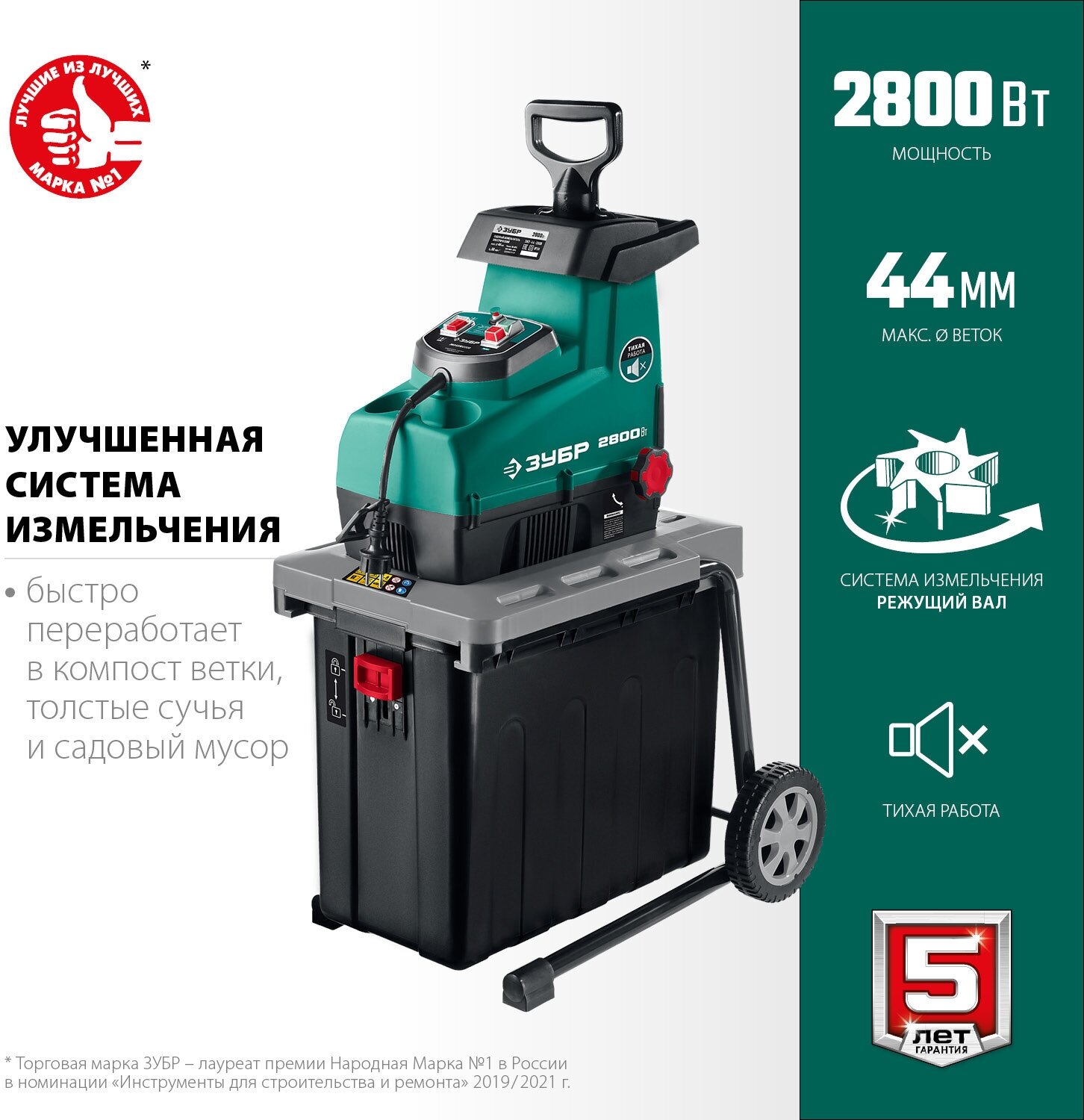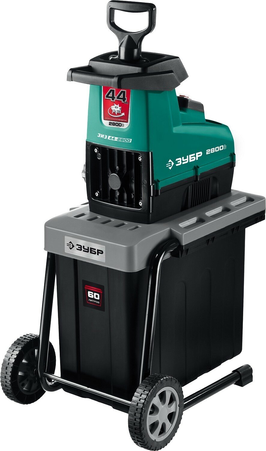 Description: Motor type: electric, power: 2800 W, purpose: grass and leaves chopping, chopping system: milling cutter, branches diameter: 40–50 mm, design features: wheels, container, pusher, waste collector: container