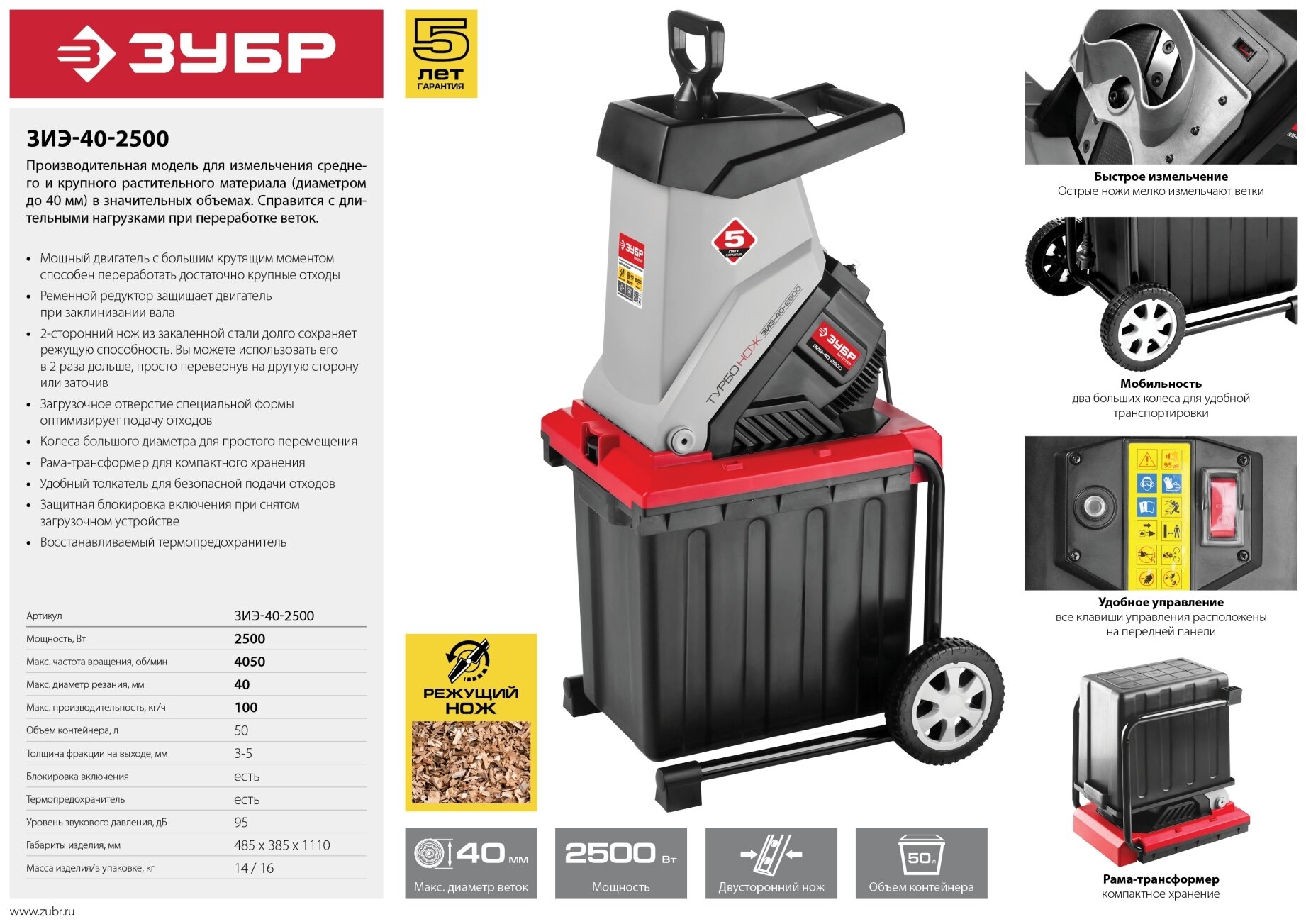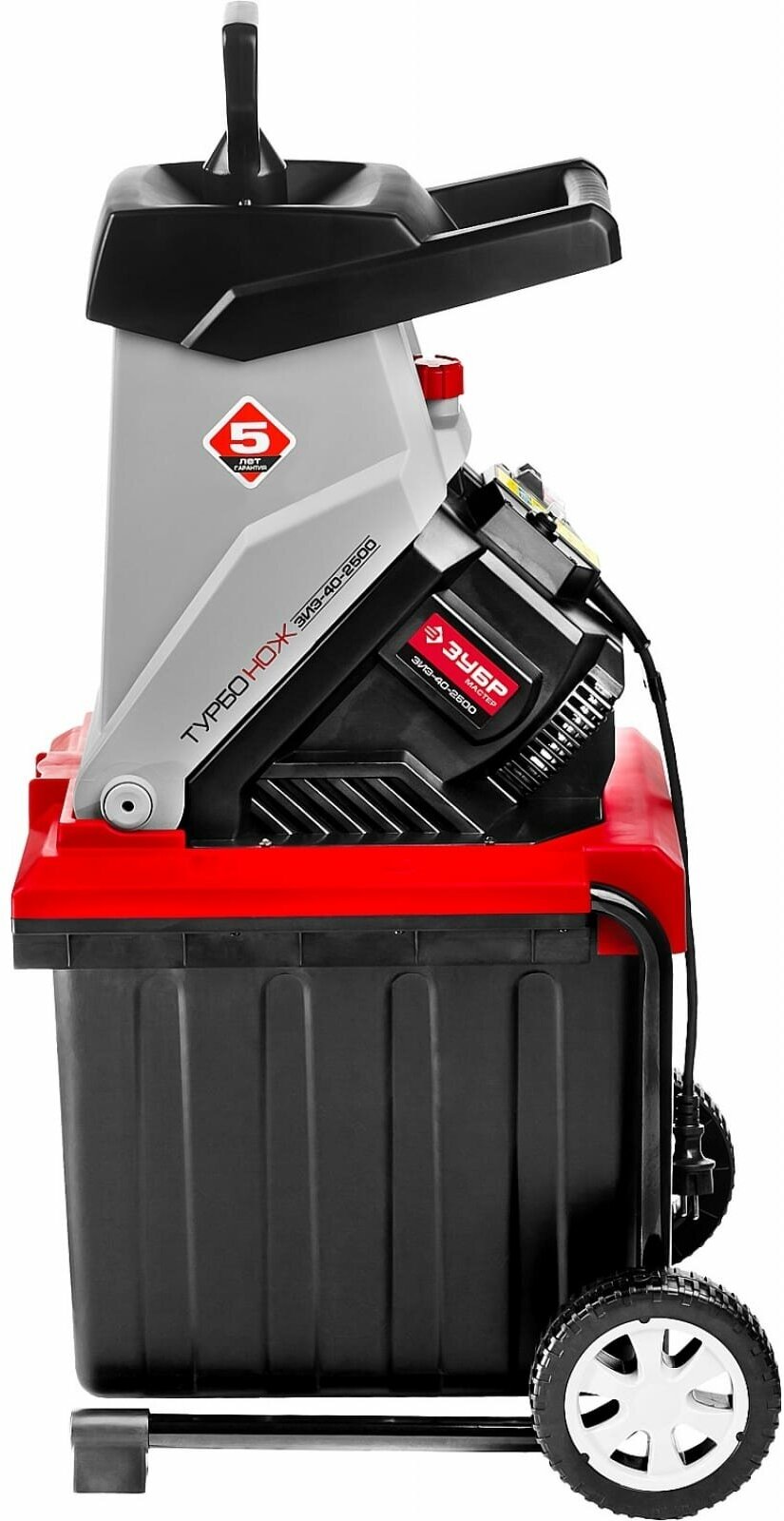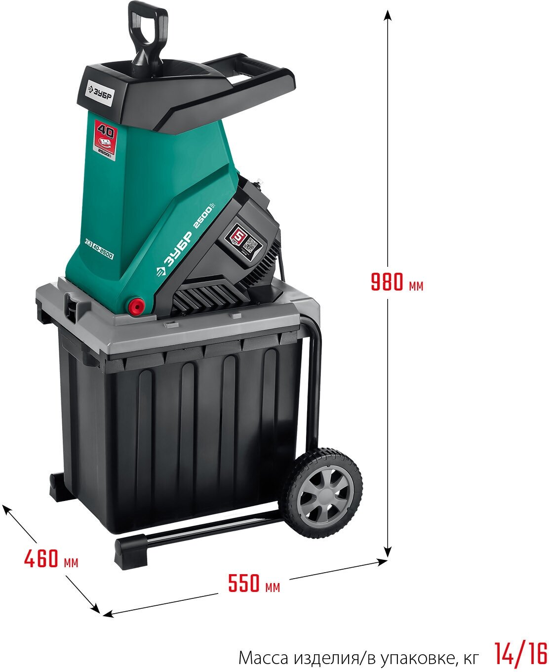 Motor type: electric, power: 2800 W, purpose: grass and leaves chopping, chopping system: milling cutter, branches diameter: 40–50 mm, design features: wheels, container, pusher, waste collector: container