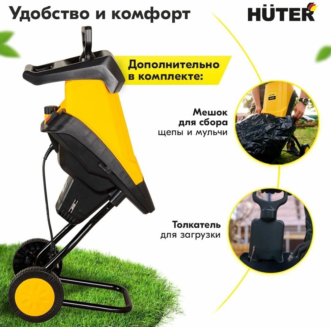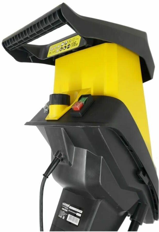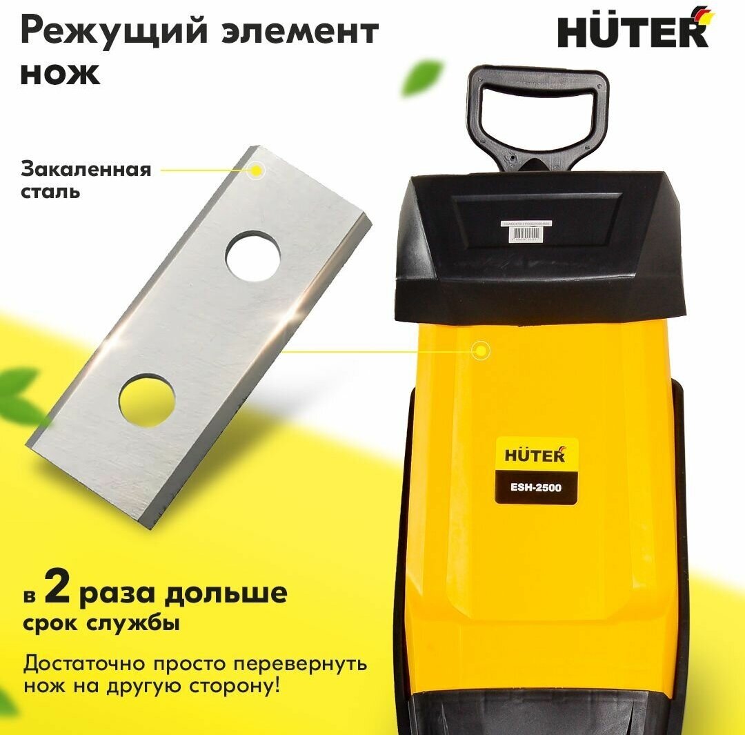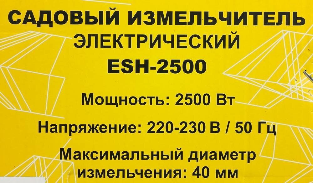 Motor type: electric, power: 2500 W, power: 2 hp, purpose: chopping branches and leaves, chopping system: cutting knives, branches diameter: 30–40 mm, capacity: 100 to 500 kg/h, additional functions