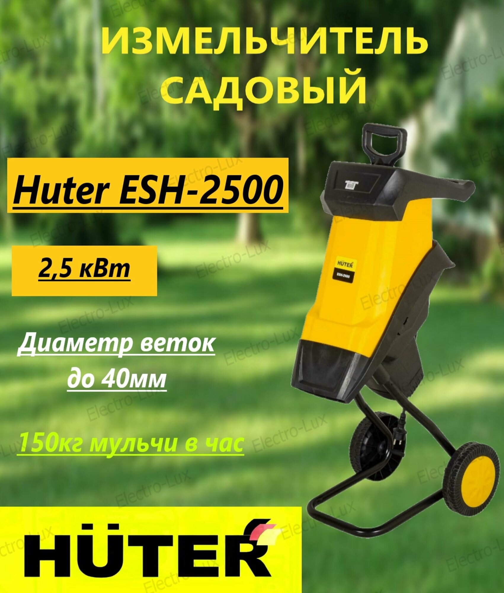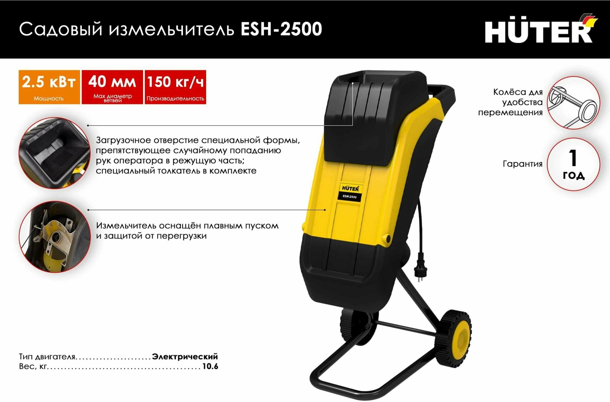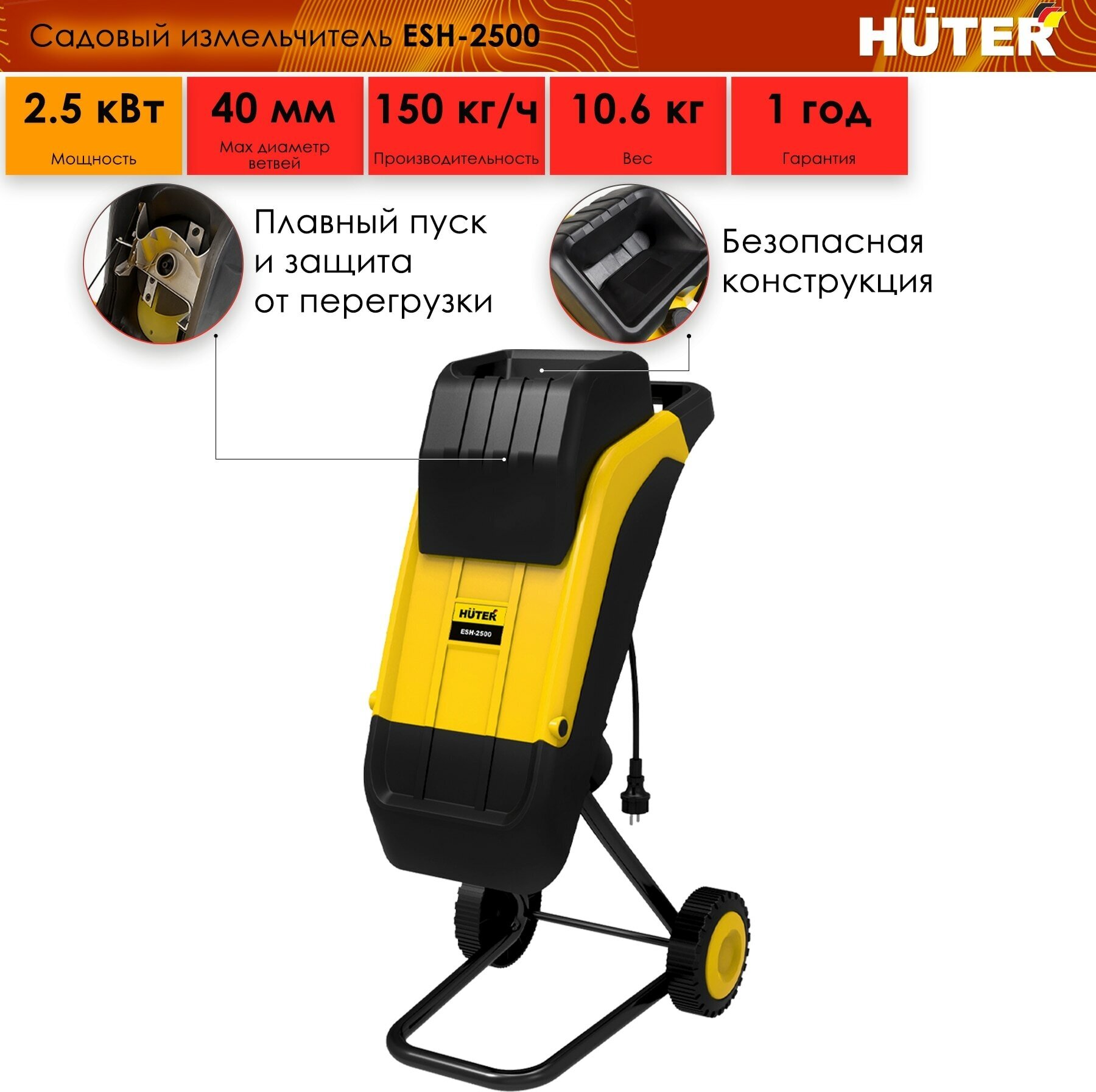 Motor type: electric, power: 2500 W, power: 2 hp, purpose: chopping branches and leaves, chopping system: cutting knives, branches diameter: 30–40 mm, capacity: 100 to 500 kg/h, additional functions