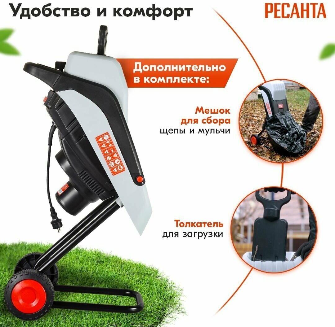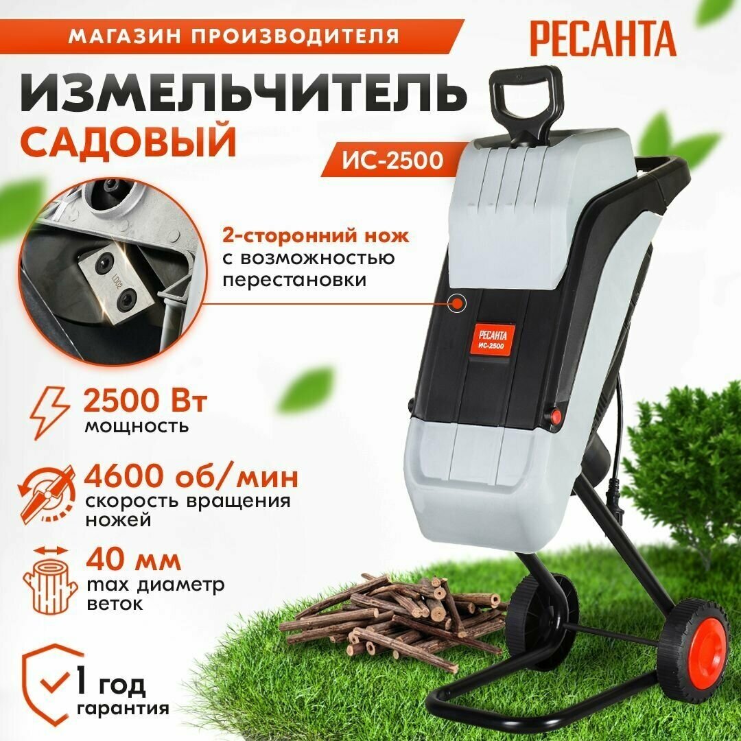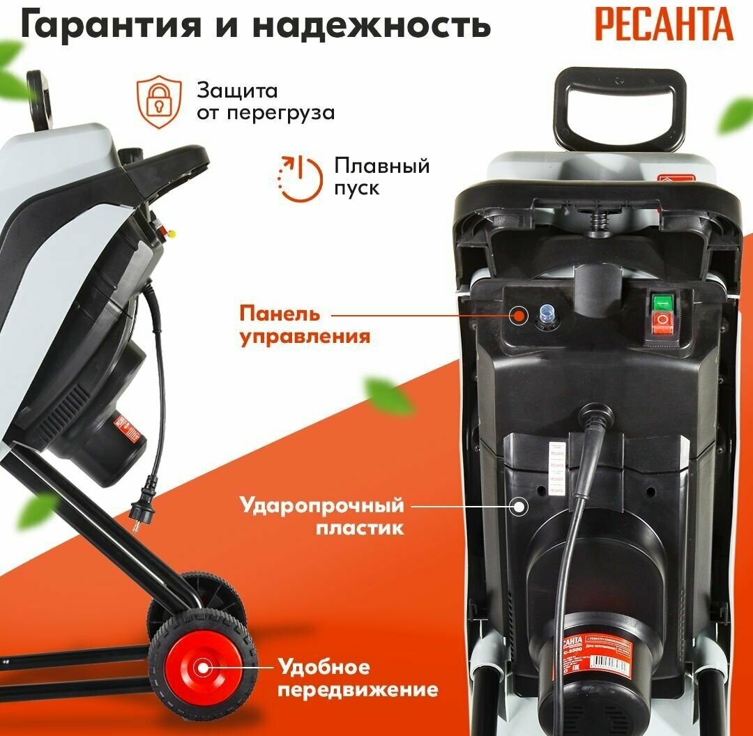 Motor type: electric, power: 2500 W, power: 3.40 hp, purpose: chopping branches, chopping system: cutting knives, branches diameter: 30–40 mm, output: from 100 to 500 kg/h, additional functions: protection